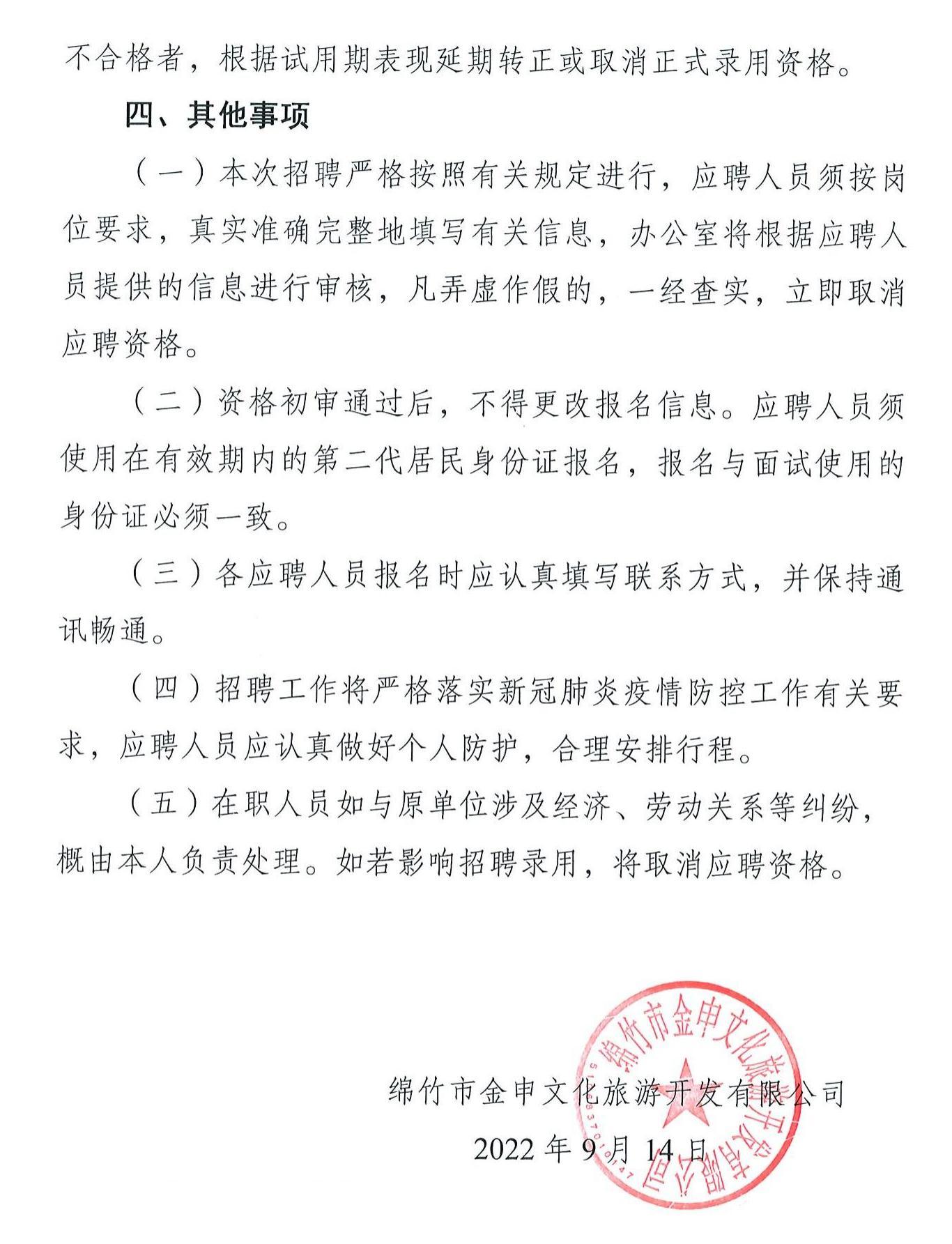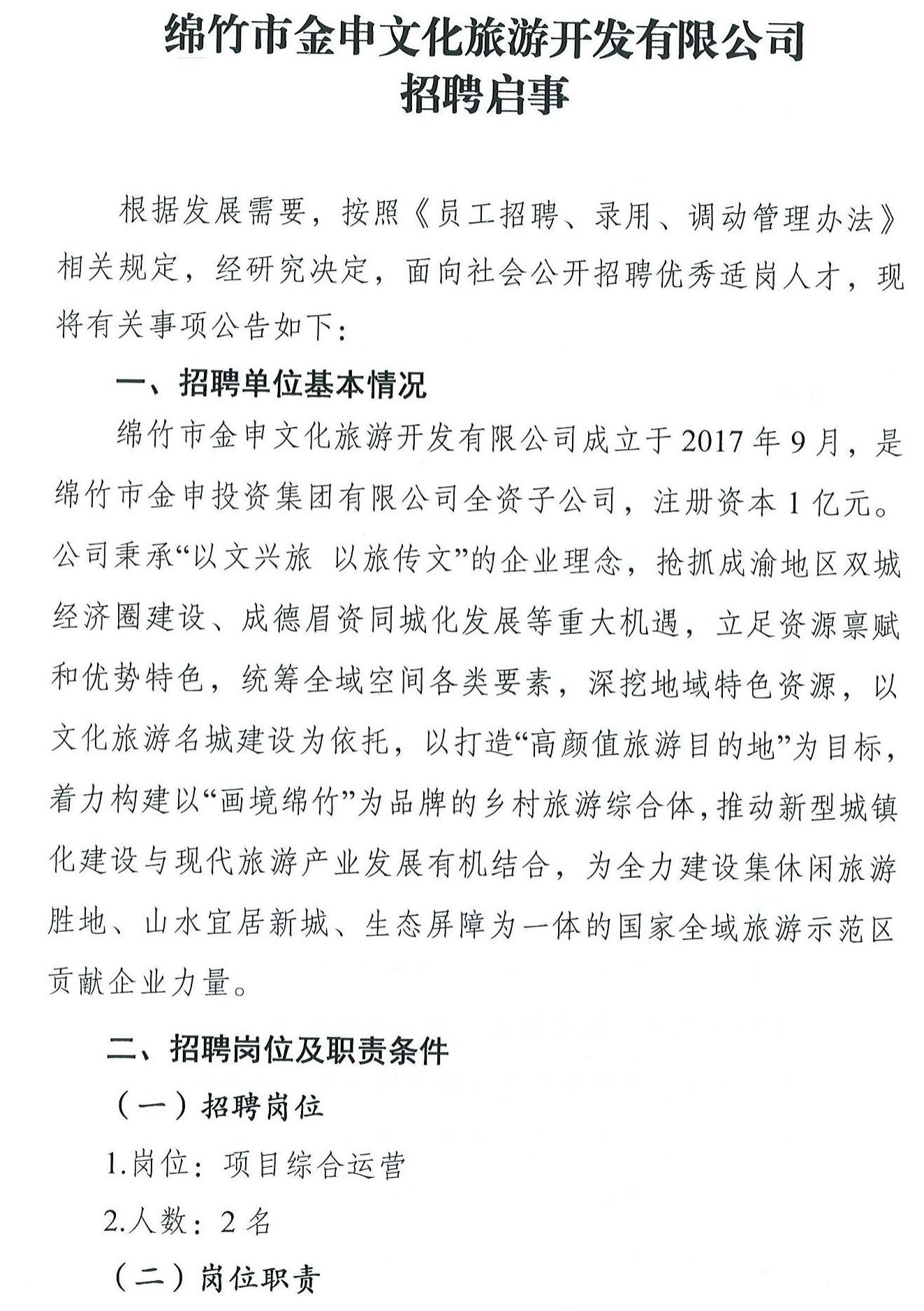 綿竹市金申文化旅游開發(fā)有限公司招聘啟事