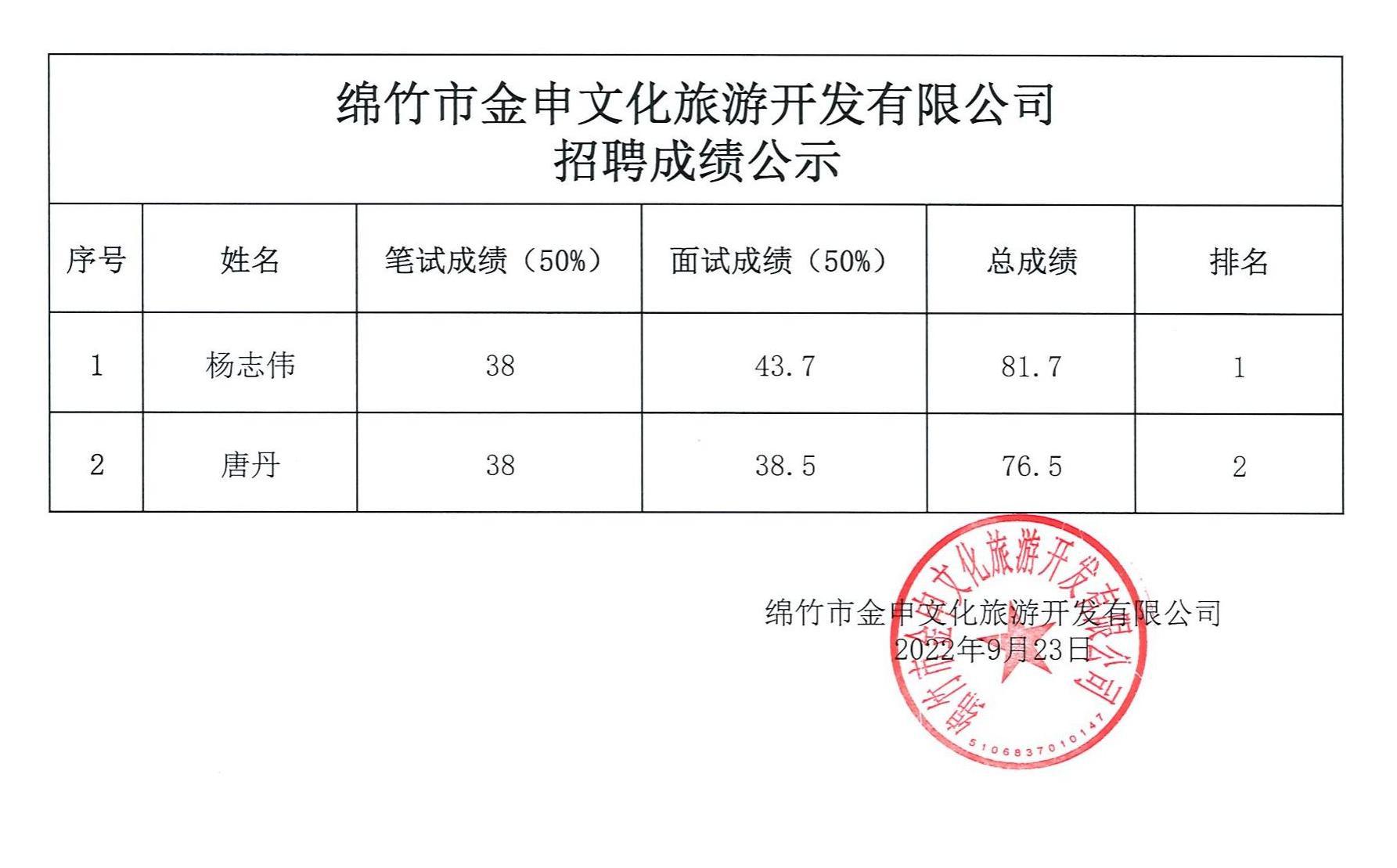 綿竹市金申文化旅游開發(fā)有限公司招聘成績公示