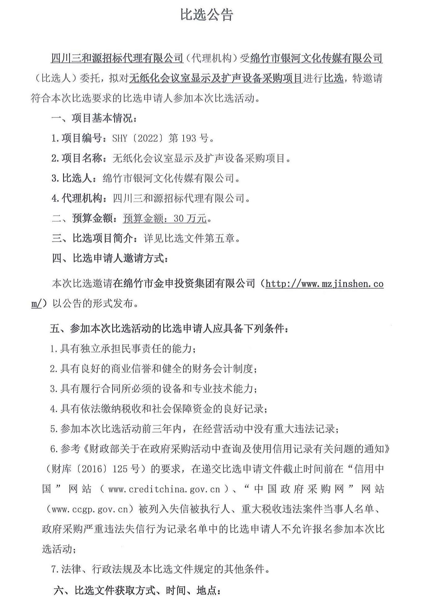 無(wú)紙化會(huì)議室顯示及擴(kuò)聲設(shè)備采購(gòu)項(xiàng)目比選公告