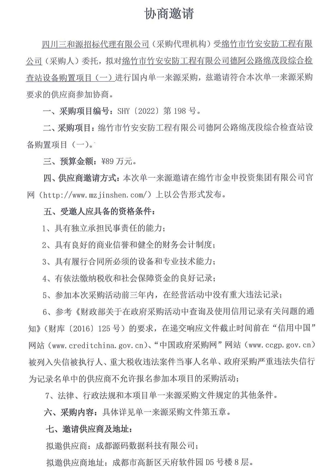 德阿公路綿茂段檢查站設(shè)備購(gòu)置項(xiàng)目(一)協(xié)商邀請(qǐng)公告