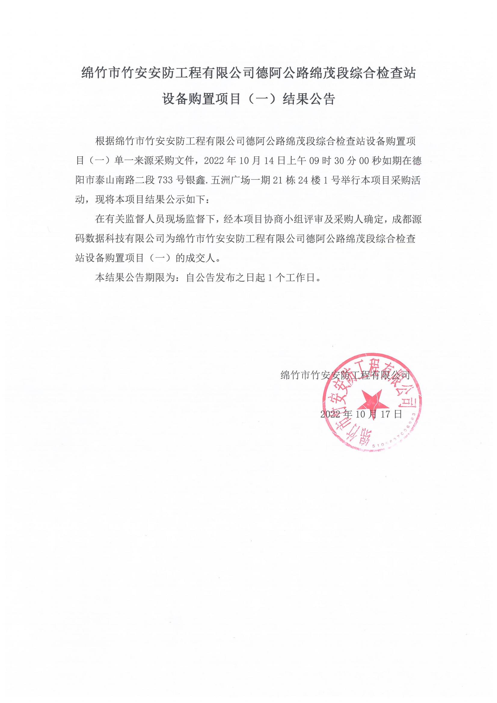德阿公路綿茂段檢查站設(shè)備購置項目(一)結(jié)果公示