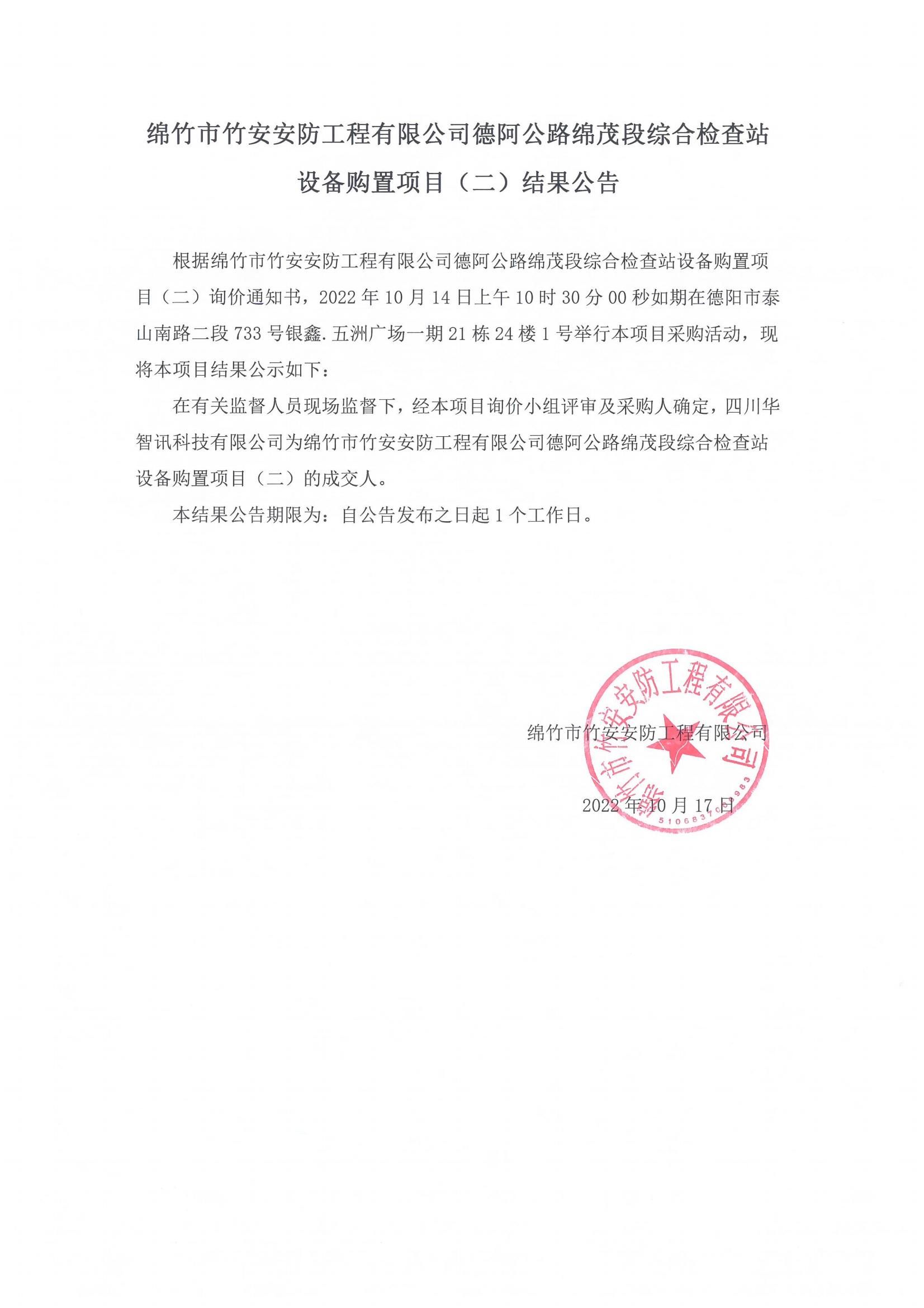 德阿公路綿茂段檢查站設備購置項目(二)結果公告