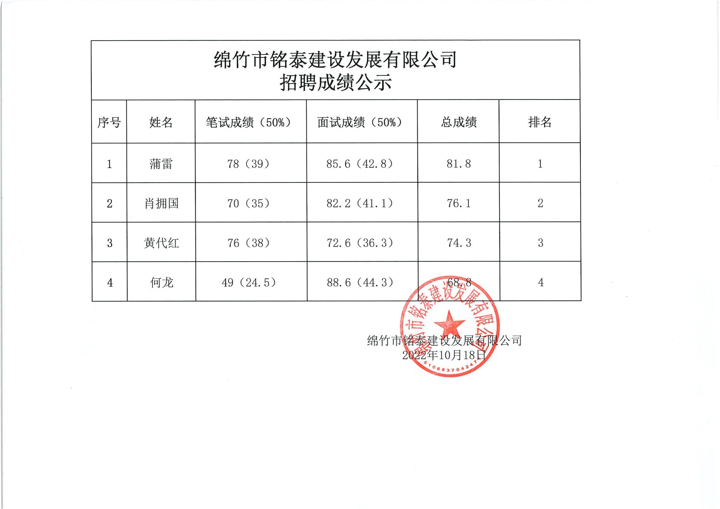 綿竹市銘泰建設(shè)發(fā)展有限公司招聘成績公示