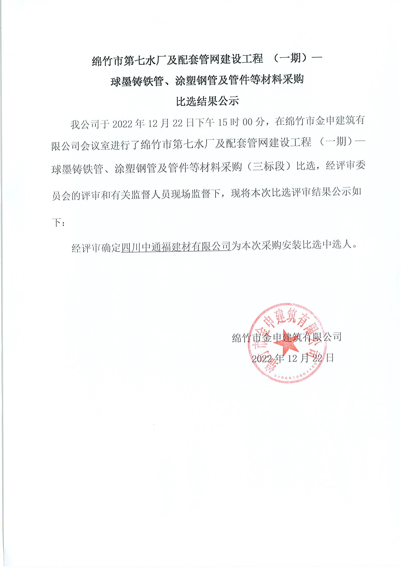 綿竹第七水廠配套管網(wǎng)建設(shè)工程(三標(biāo)段)比選結(jié)果公示