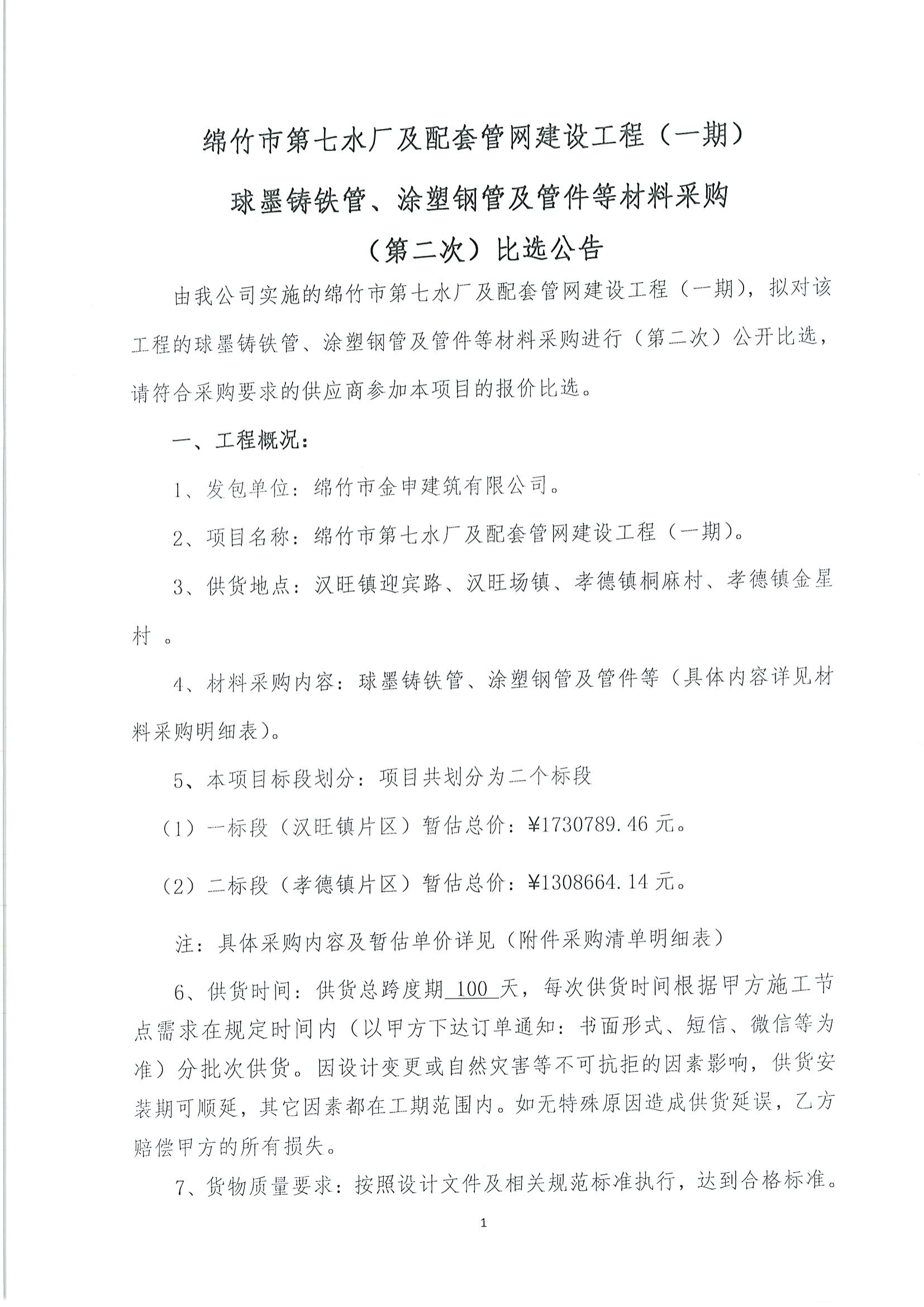 綿竹市第七水廠及配套管網(wǎng)建設(shè)工程(一期)材料采購(gòu)比選公告