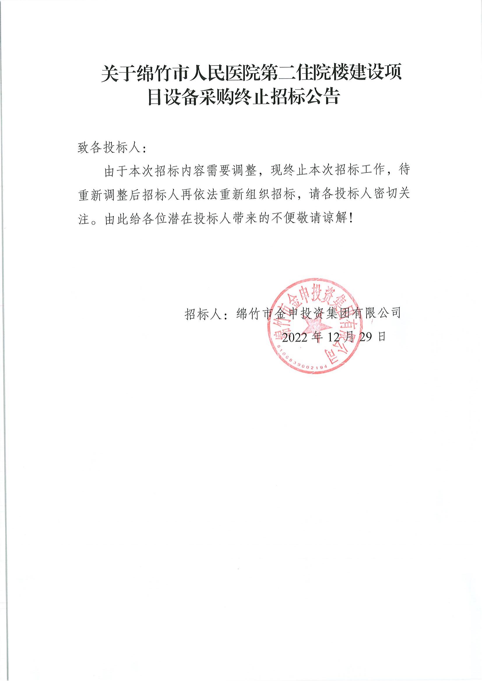 綿竹市人民醫(yī)院第二住院樓建設(shè)項(xiàng)目設(shè)備采購(gòu)終止招標(biāo)公告