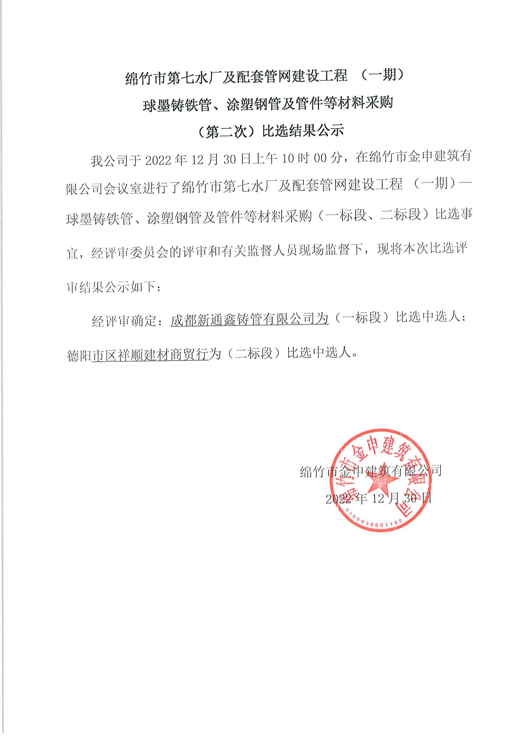 綿竹第七水廠配套管網(wǎng)建設工程一期第二次比選結(jié)果公示