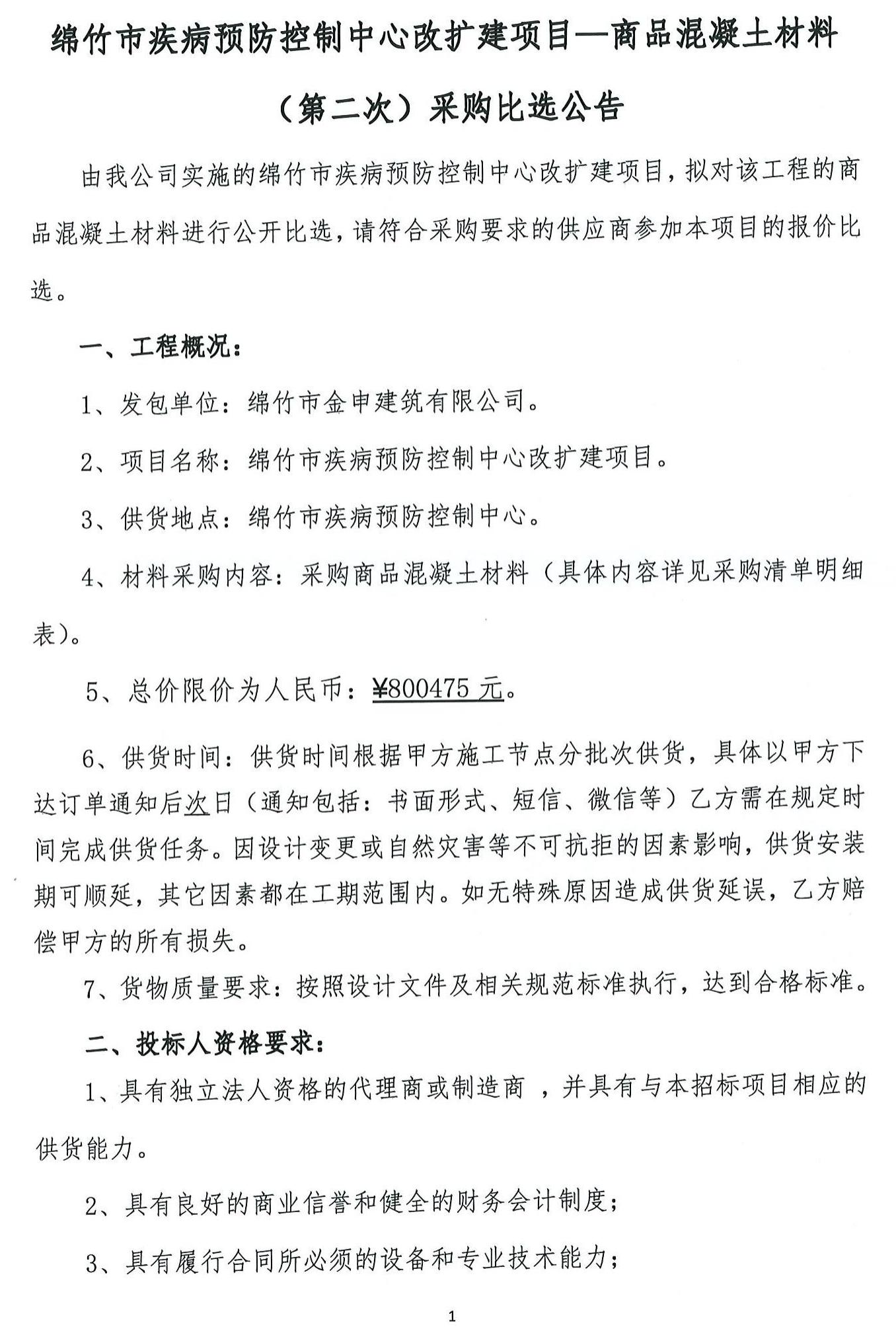 綿竹疾病預(yù)防中心改擴(kuò)建項(xiàng)目(商品混凝土)第二次比選公告