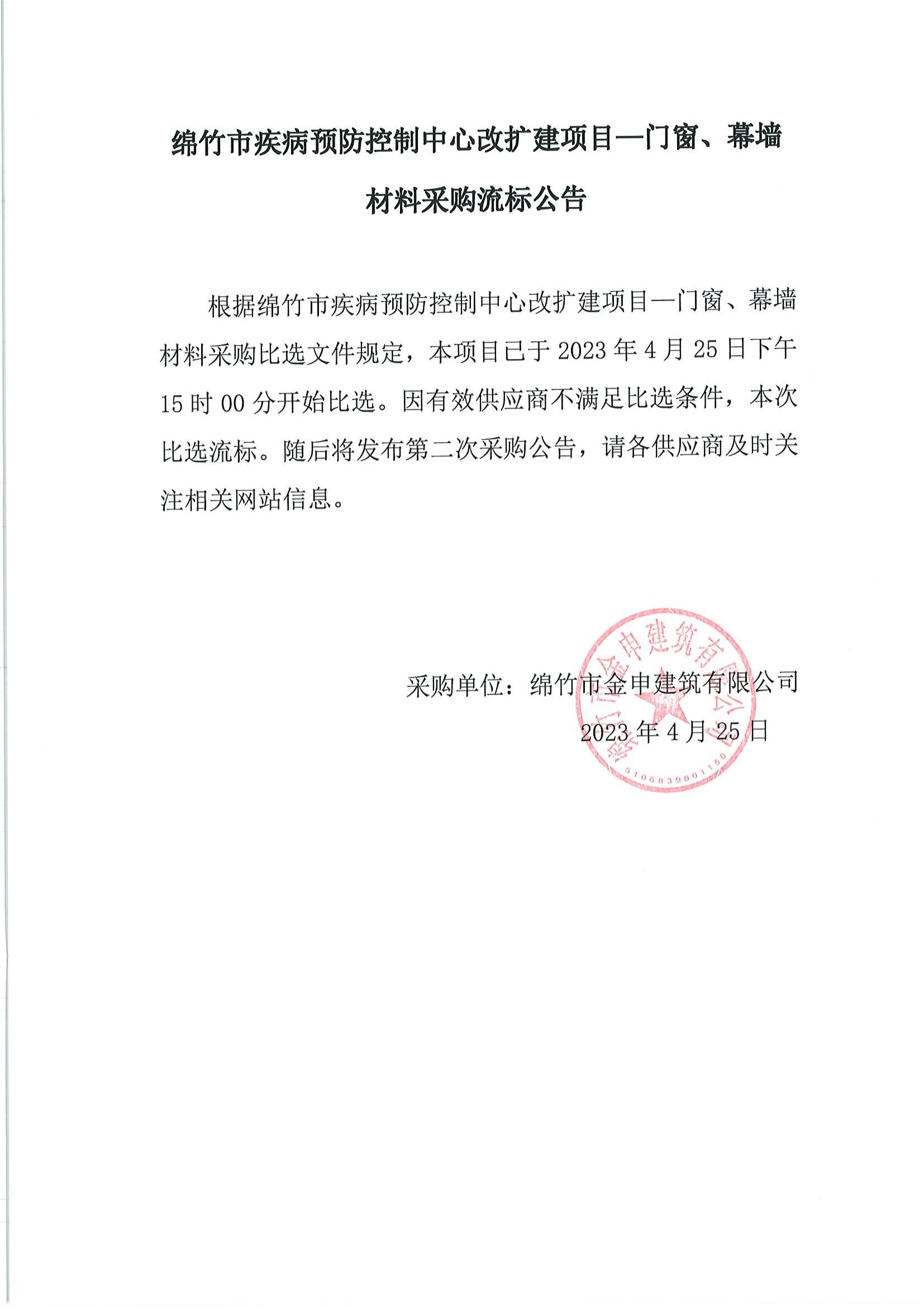 綿竹市疾病預防控制中心改擴建項目門窗幕墻采購流標公告