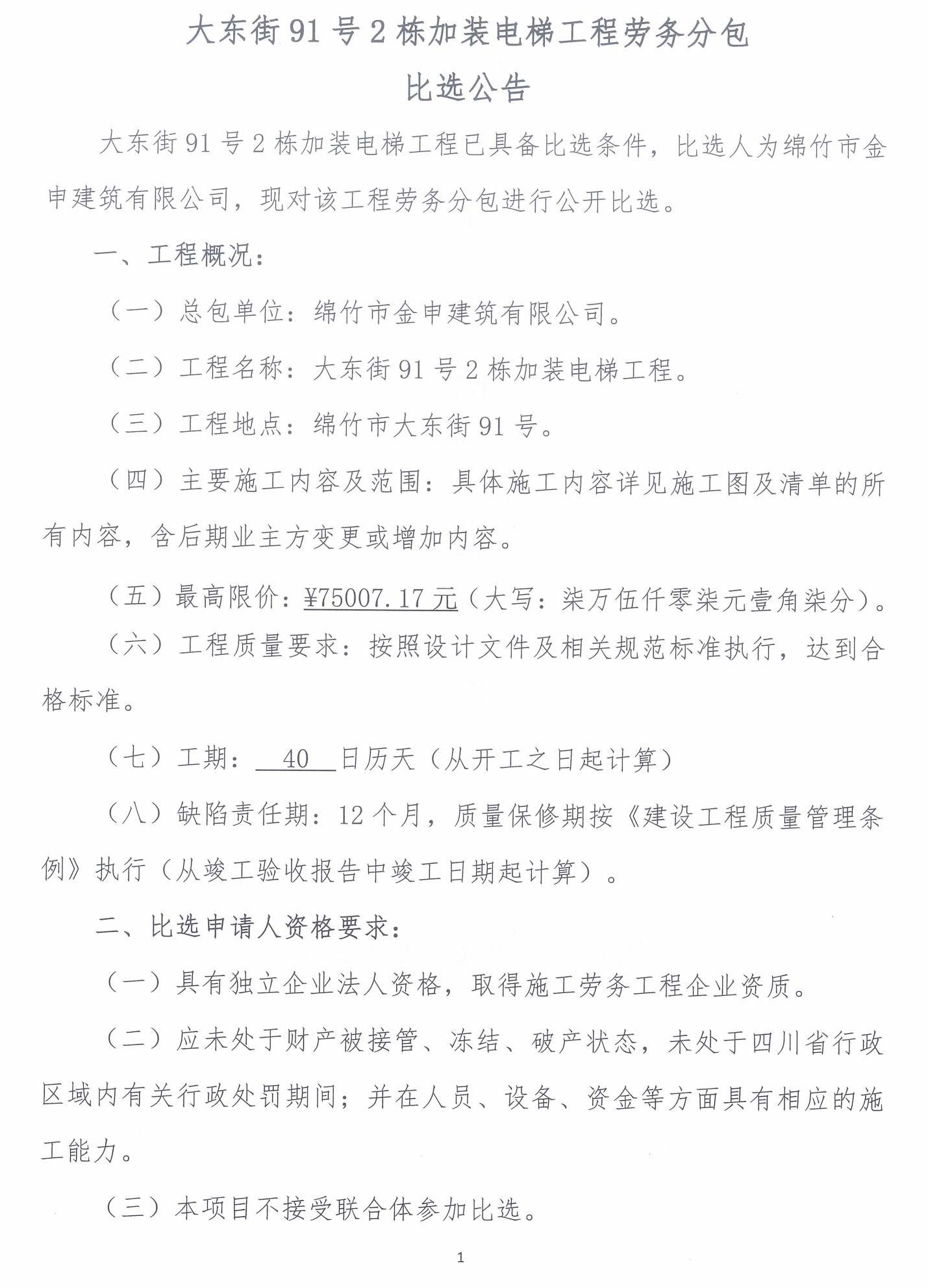 大東街91號2棟加裝電梯工程勞務分包比選公告