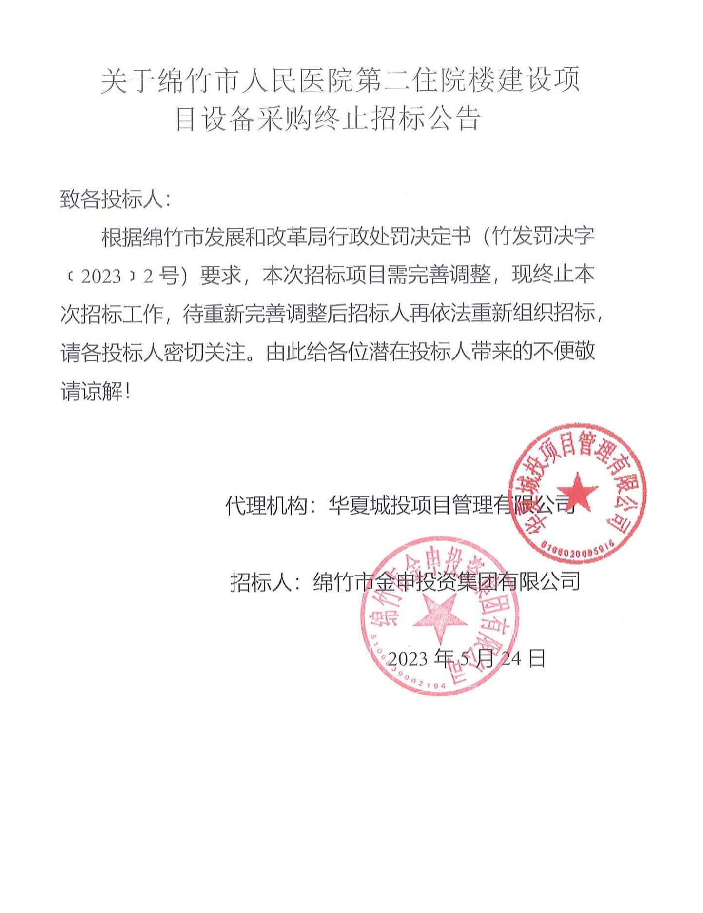 綿竹市人民醫(yī)院第二住院樓建設項目設備采購終止招標公告