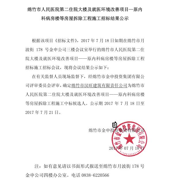 綿竹市人民醫(yī)院原內(nèi)科病房樓等房屋拆除工程施工招標(biāo)結(jié)果