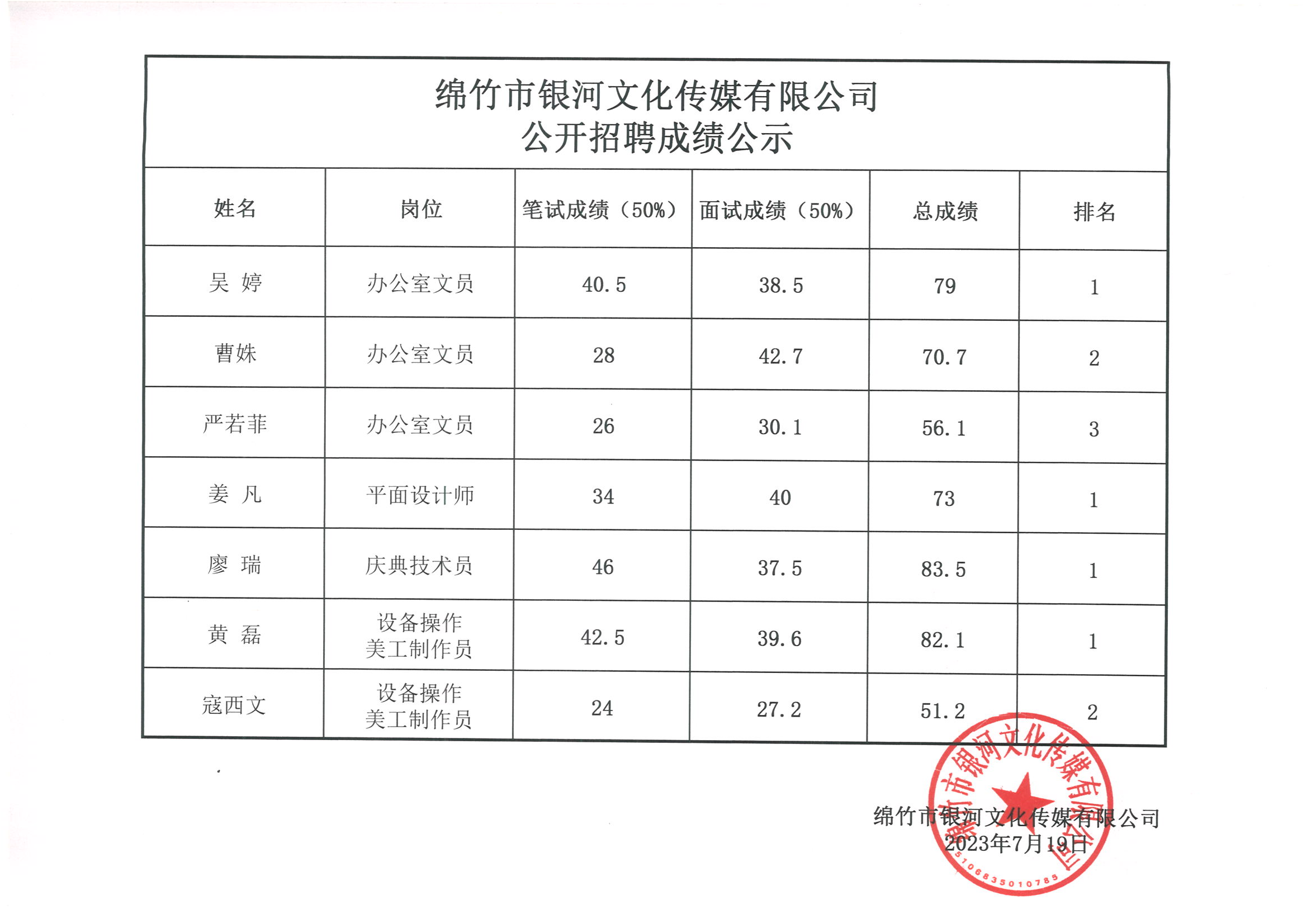綿竹市銀河文化傳媒有限公司公開招聘成績公示
