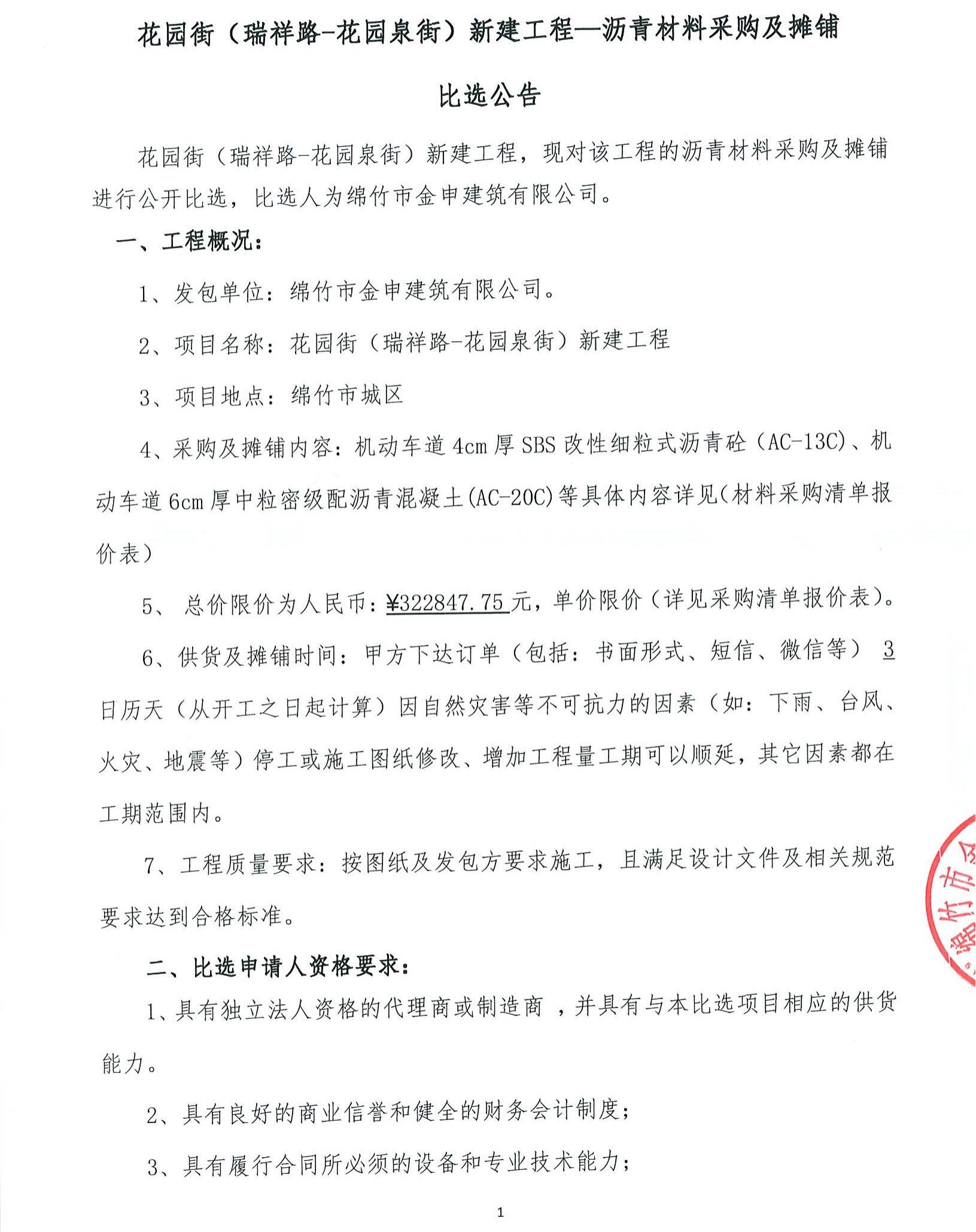 花園街(瑞祥路-花園泉街)工程瀝青材料及攤鋪比選公告