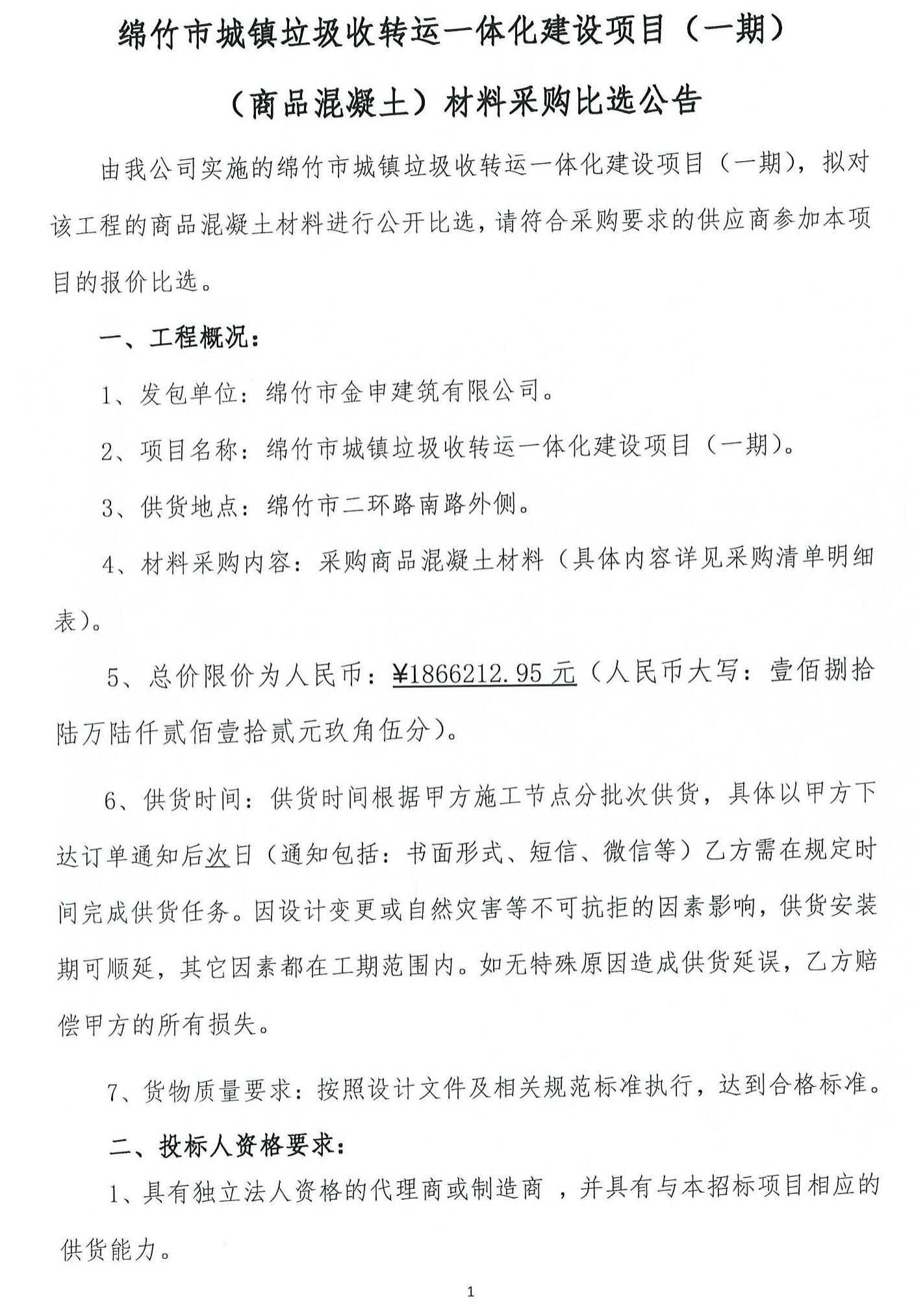 城鎮(zhèn)垃圾收轉運一體化項目(一期)商品混凝土比選公告