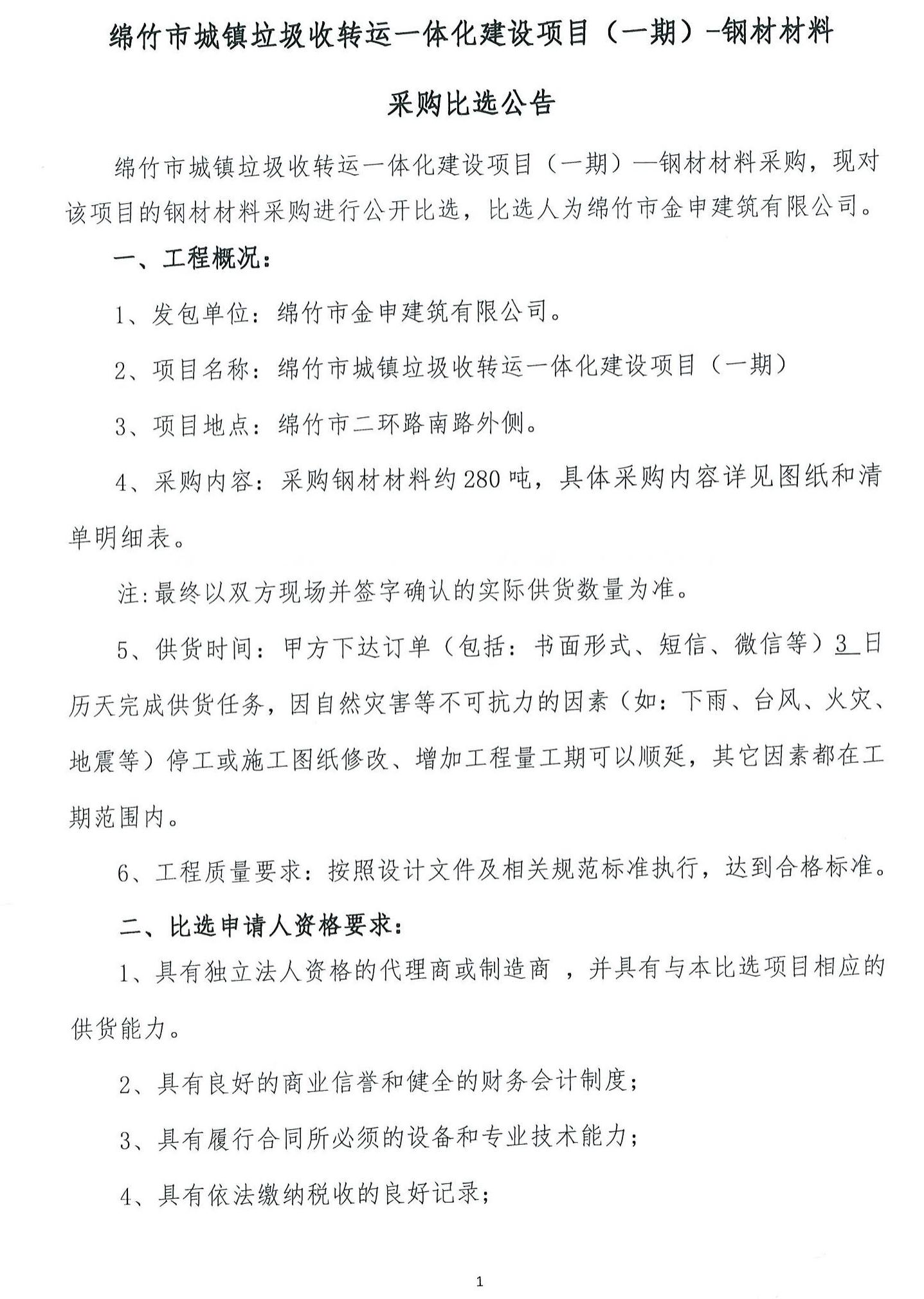 城鎮(zhèn)垃圾收轉(zhuǎn)運一體化建設(shè)項目(一期)鋼材采購比選公告