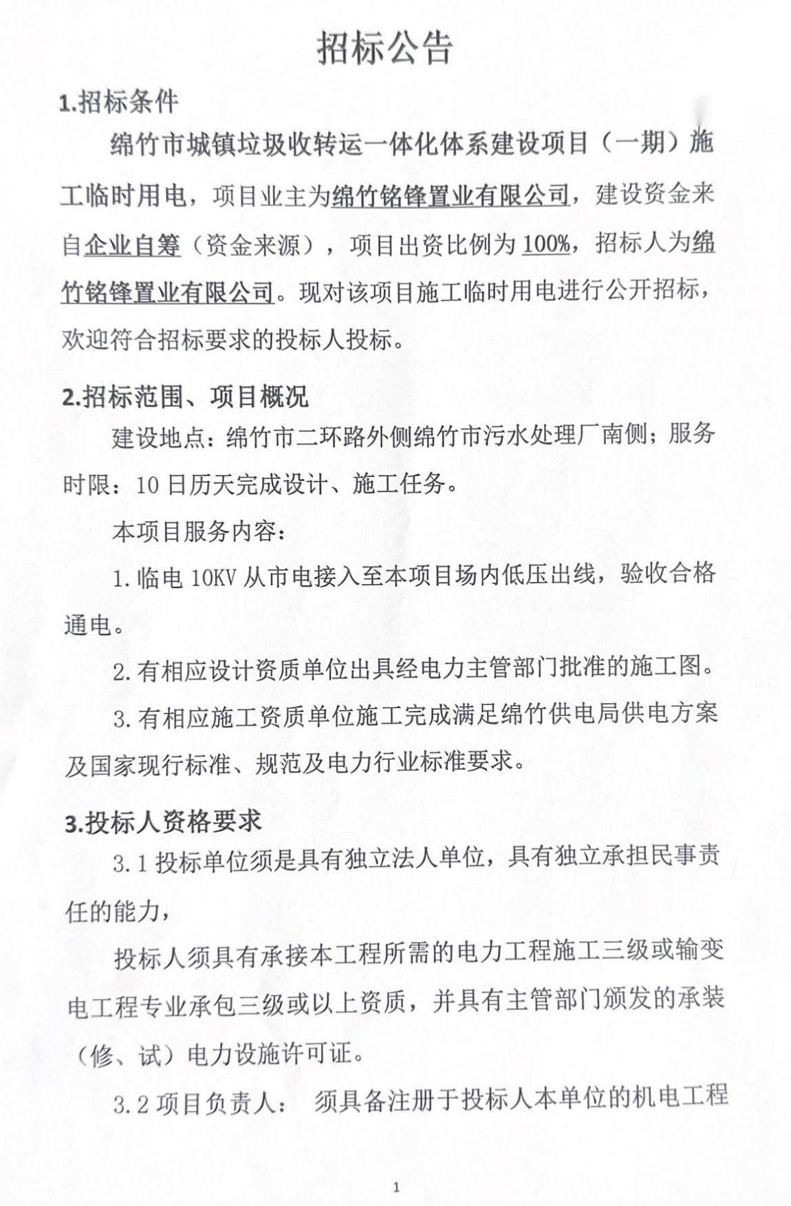 城鎮(zhèn)垃圾收轉運一體化建設項目(一期)臨時用電招標公告