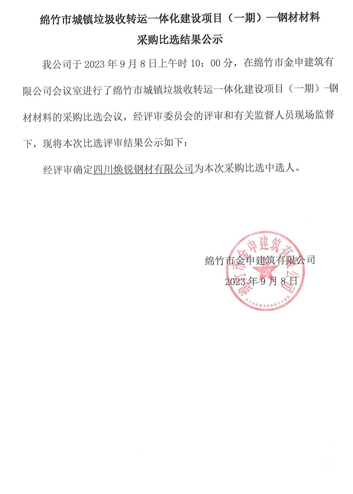城鎮(zhèn)垃圾收轉(zhuǎn)運(yùn)一體化建設(shè)項(xiàng)目(一期)—鋼材結(jié)果公示