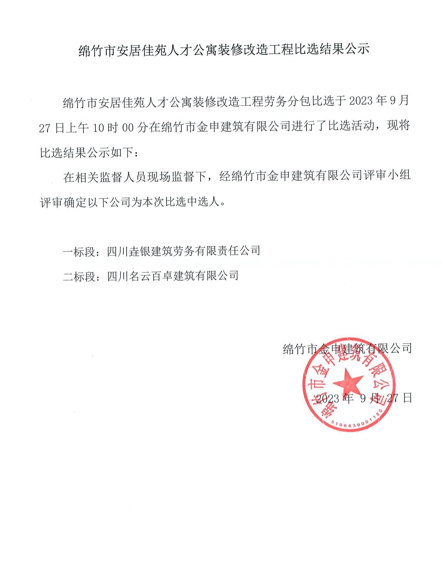 綿竹市安居佳苑人才公寓裝修改造工程比選結(jié)果公示