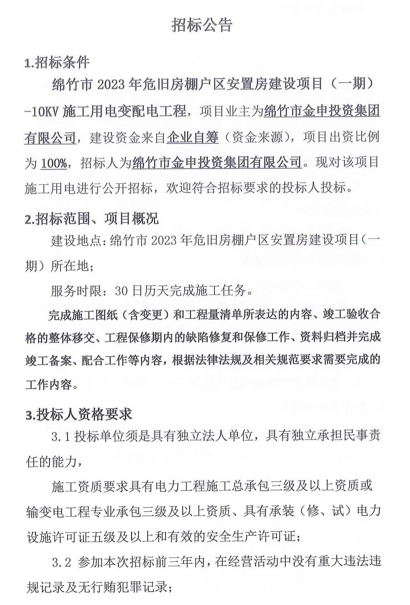 綿竹市2023年危舊房棚戶區(qū)安置房(一期)變配電招標(biāo)公告