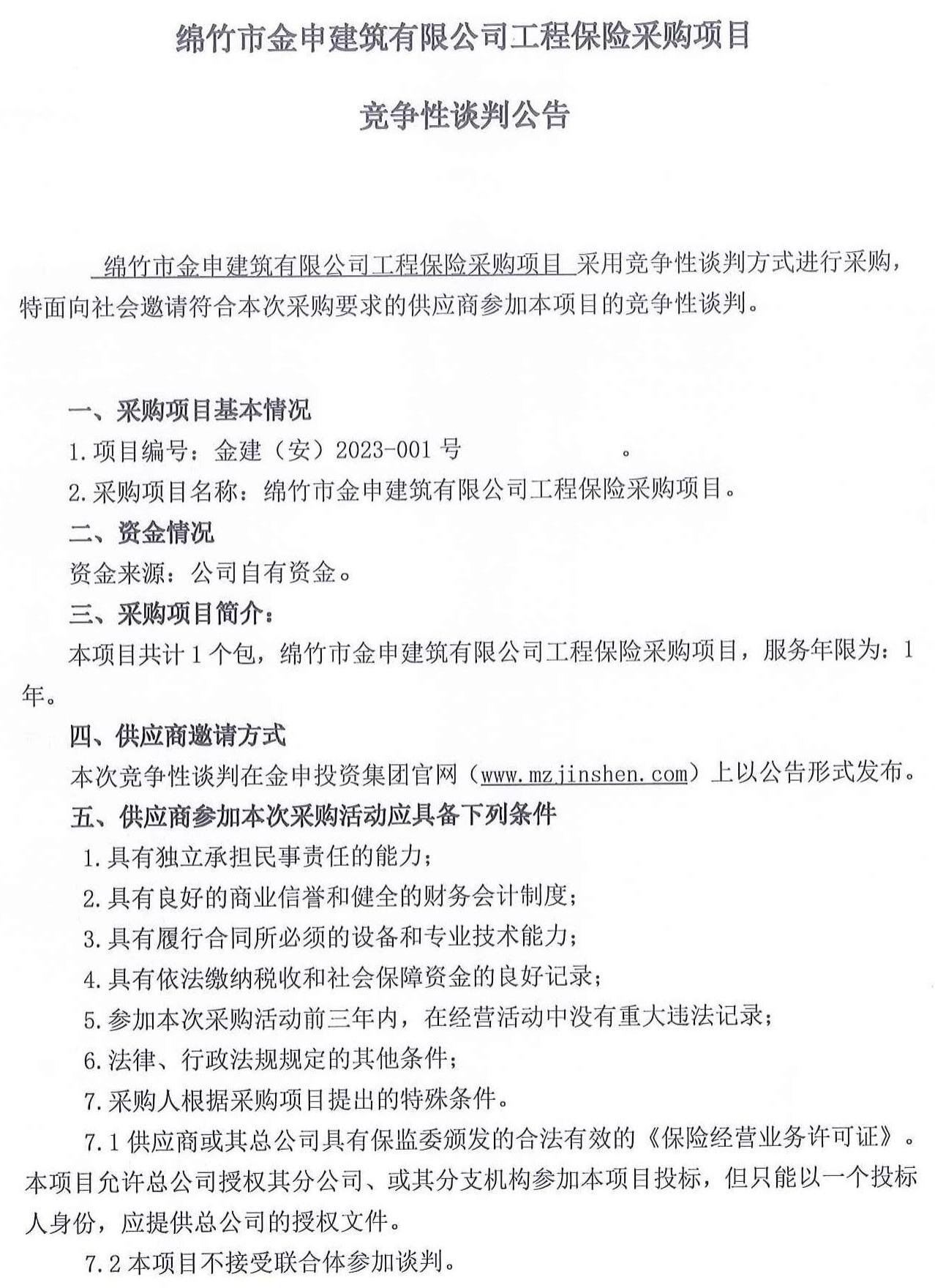 金申建筑有限公司工程保險采購項目競爭性談判比選公告