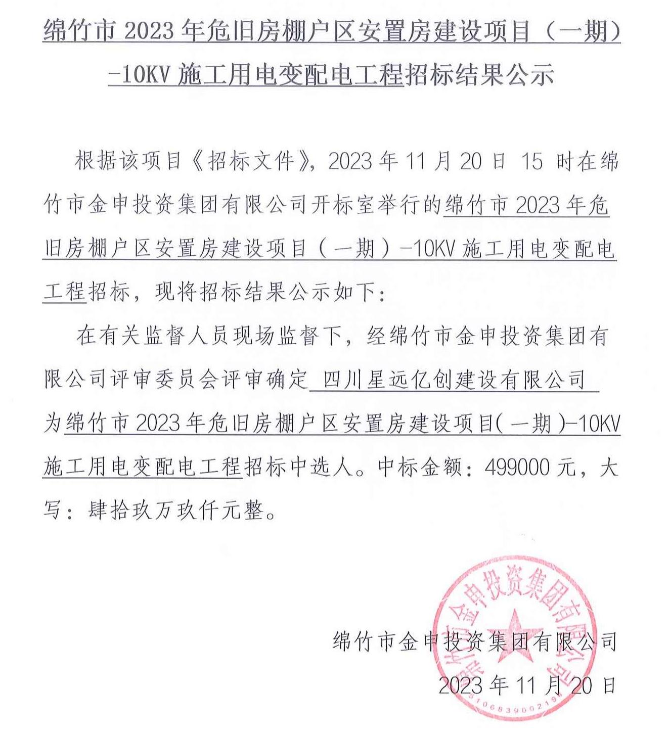 綿竹2023年危舊房棚戶區(qū)安置房(一期)變配電招標(biāo)結(jié)果公示