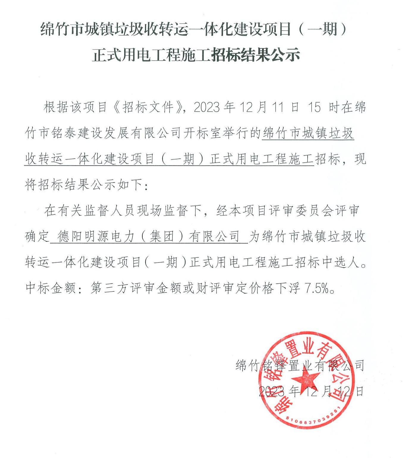 城鎮(zhèn)垃圾收轉(zhuǎn)運一體化建設(shè)項目(一期)正式用電結(jié)果公示