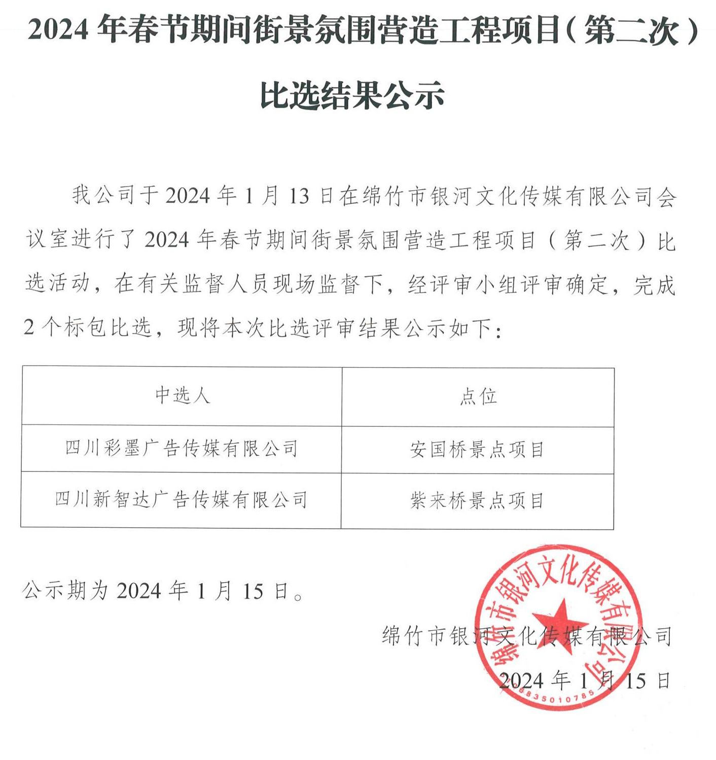 春節(jié)期間街景氛圍營造工程(第二次比選結(jié)果公告