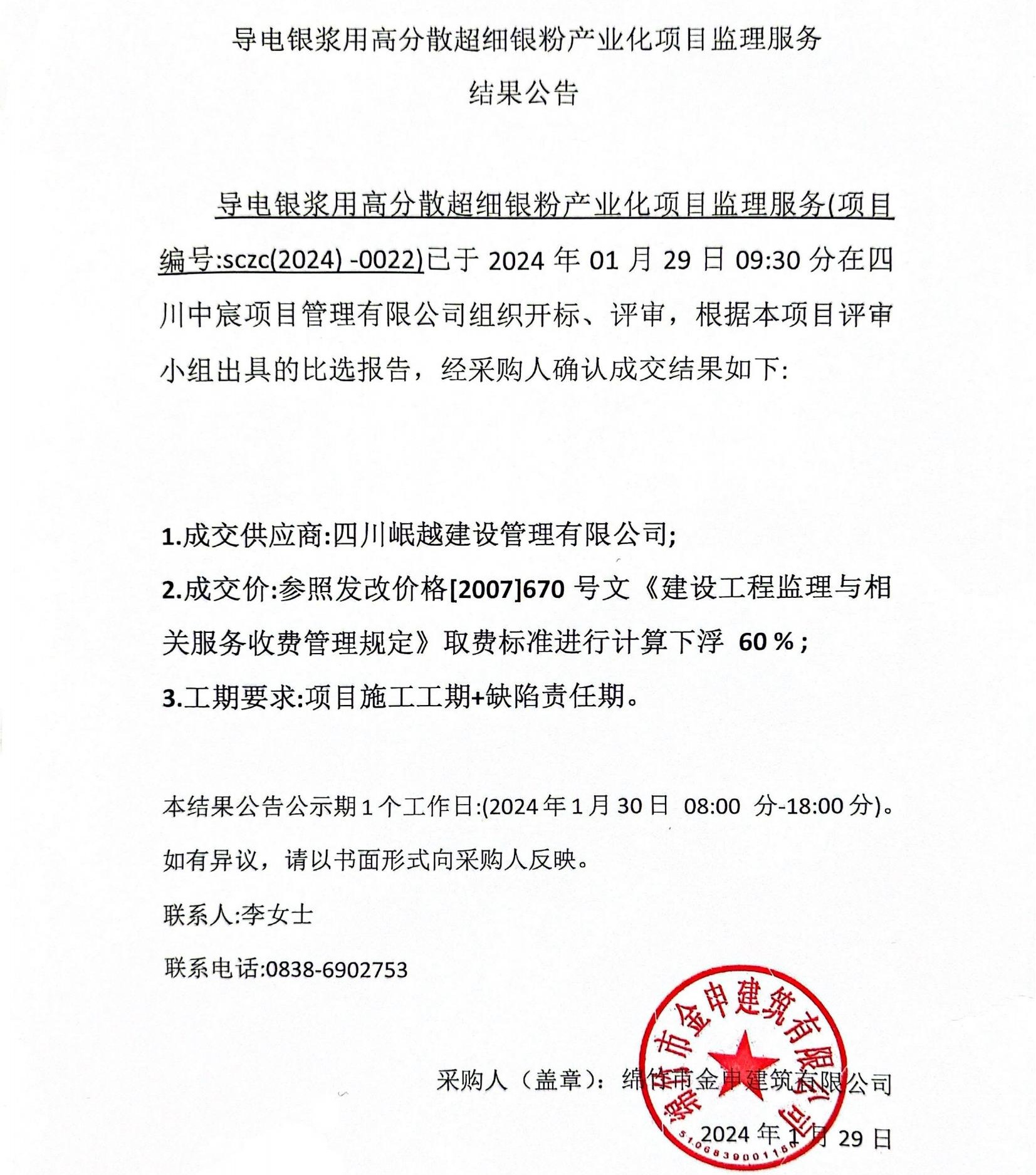 導電銀漿用高分散超細銀粉產(chǎn)業(yè)化項目監(jiān)理服務結(jié)果公示