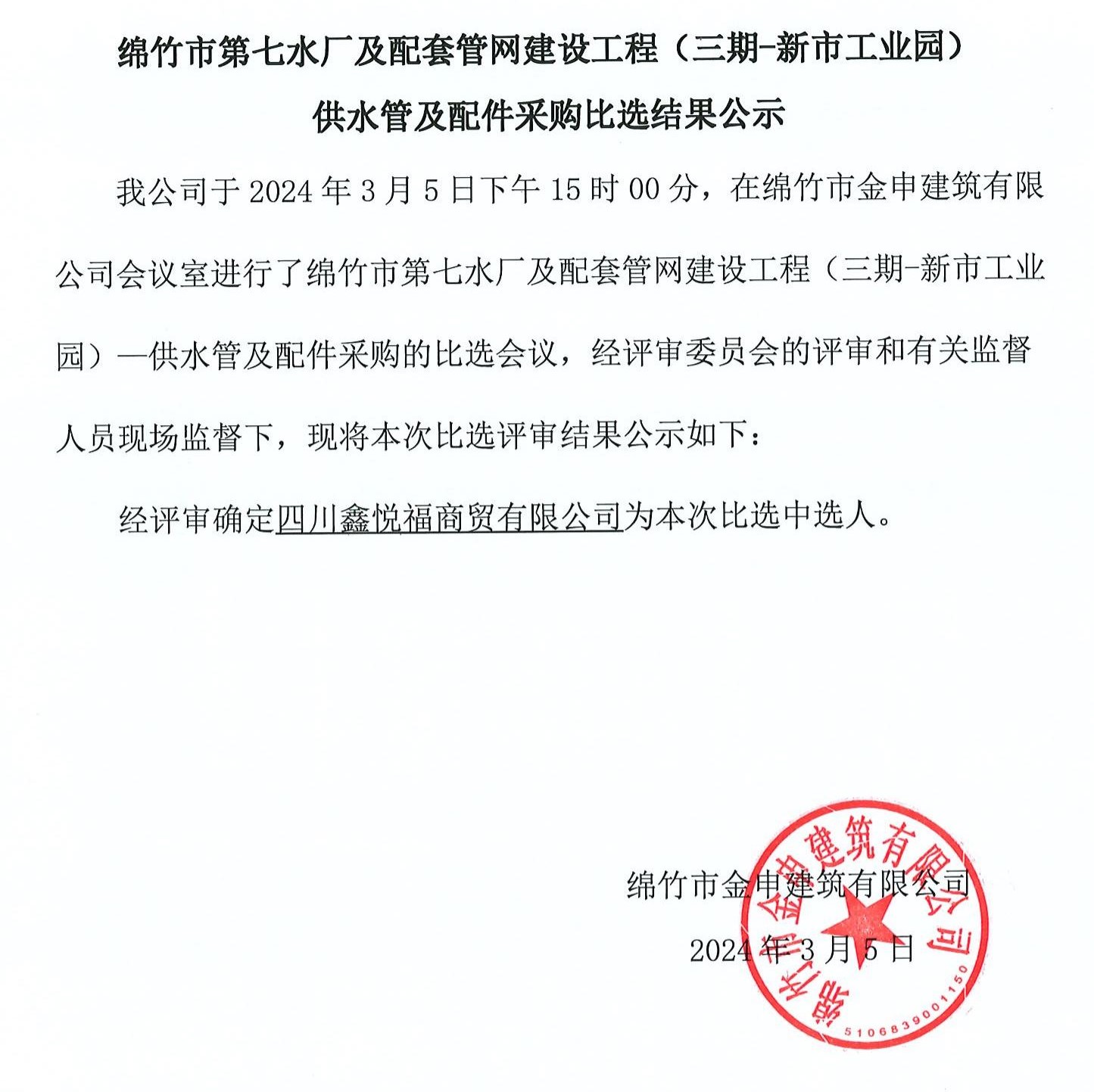第七水廠及配套管網(三期新市工業(yè)園)供水管結果公示