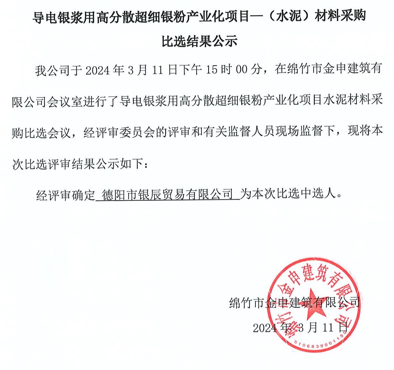 導(dǎo)電銀漿用高分散超細(xì)銀粉產(chǎn)業(yè)項目(水泥)采購結(jié)果公示