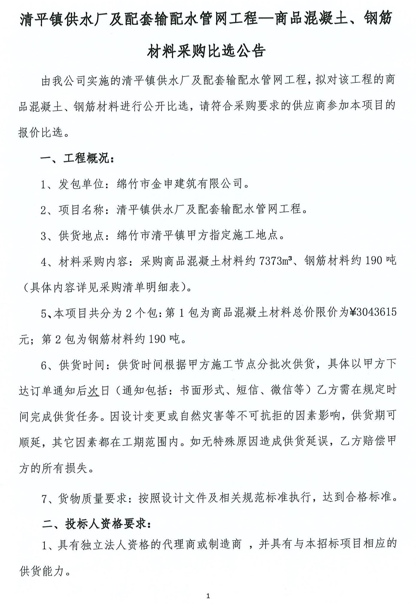 清平鎮(zhèn)供水廠及配套輸配水管網(wǎng)商品混凝土、鋼筋比選公告