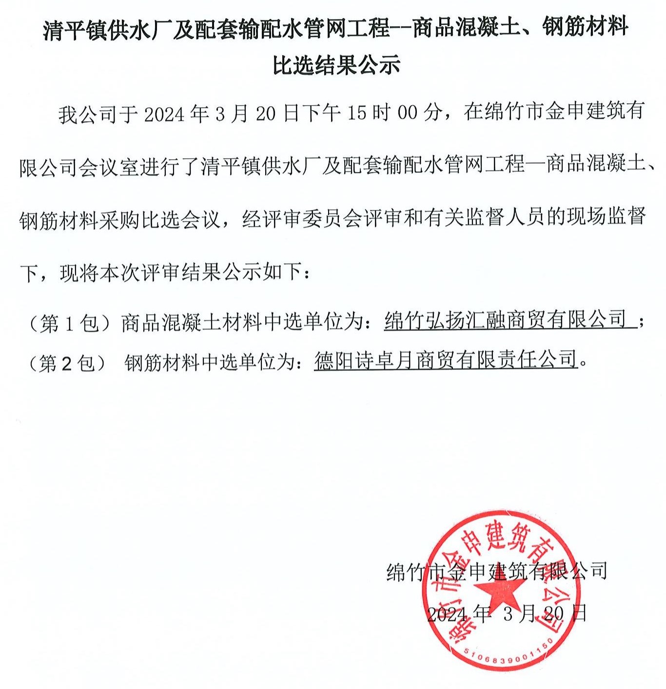 清平鎮(zhèn)供水廠及配套輸配水管網(wǎng)商品混凝土、鋼筋結(jié)果公示