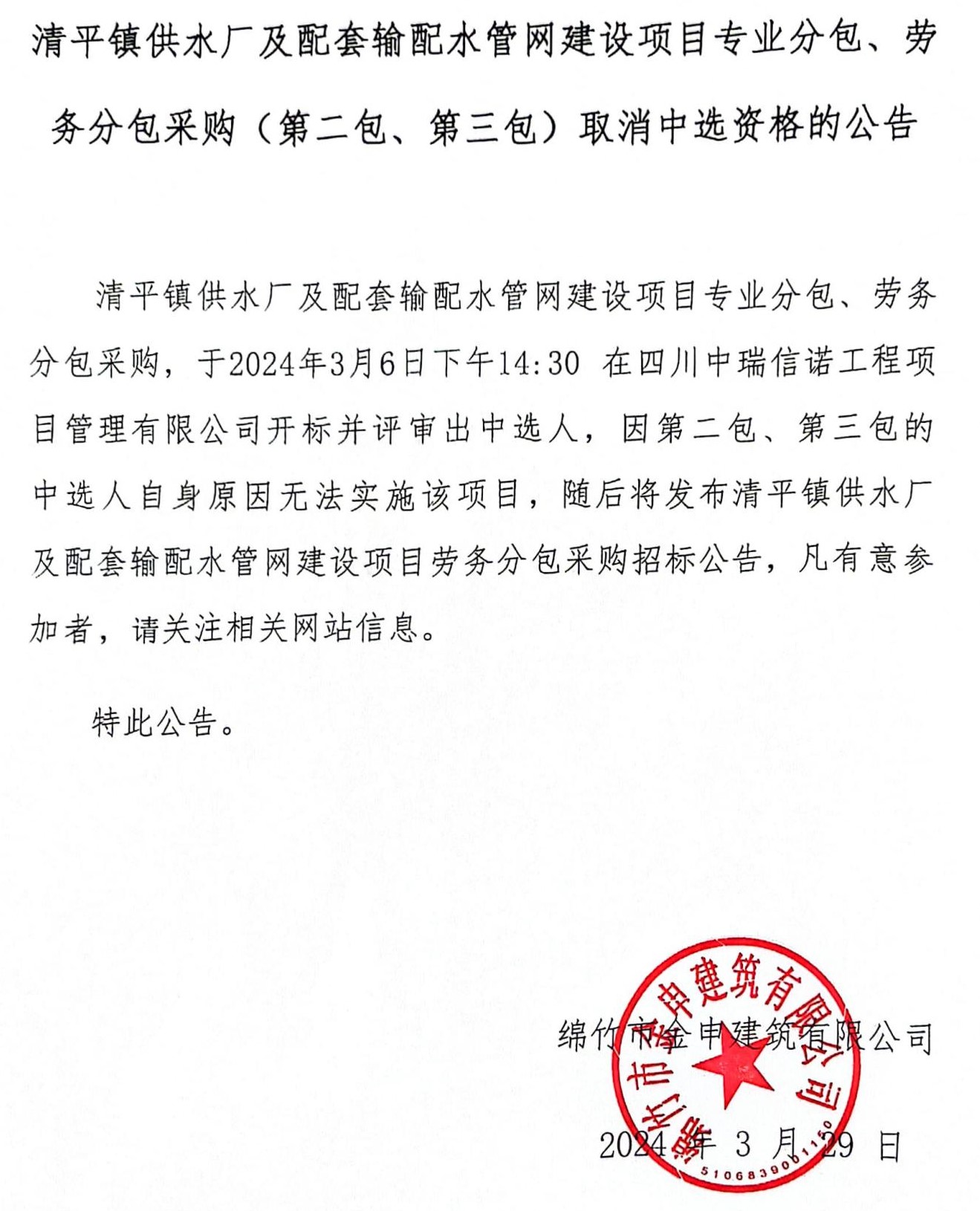 清平供水廠管網(wǎng)建設(shè)項目勞務(wù)分包取消中選資格公示