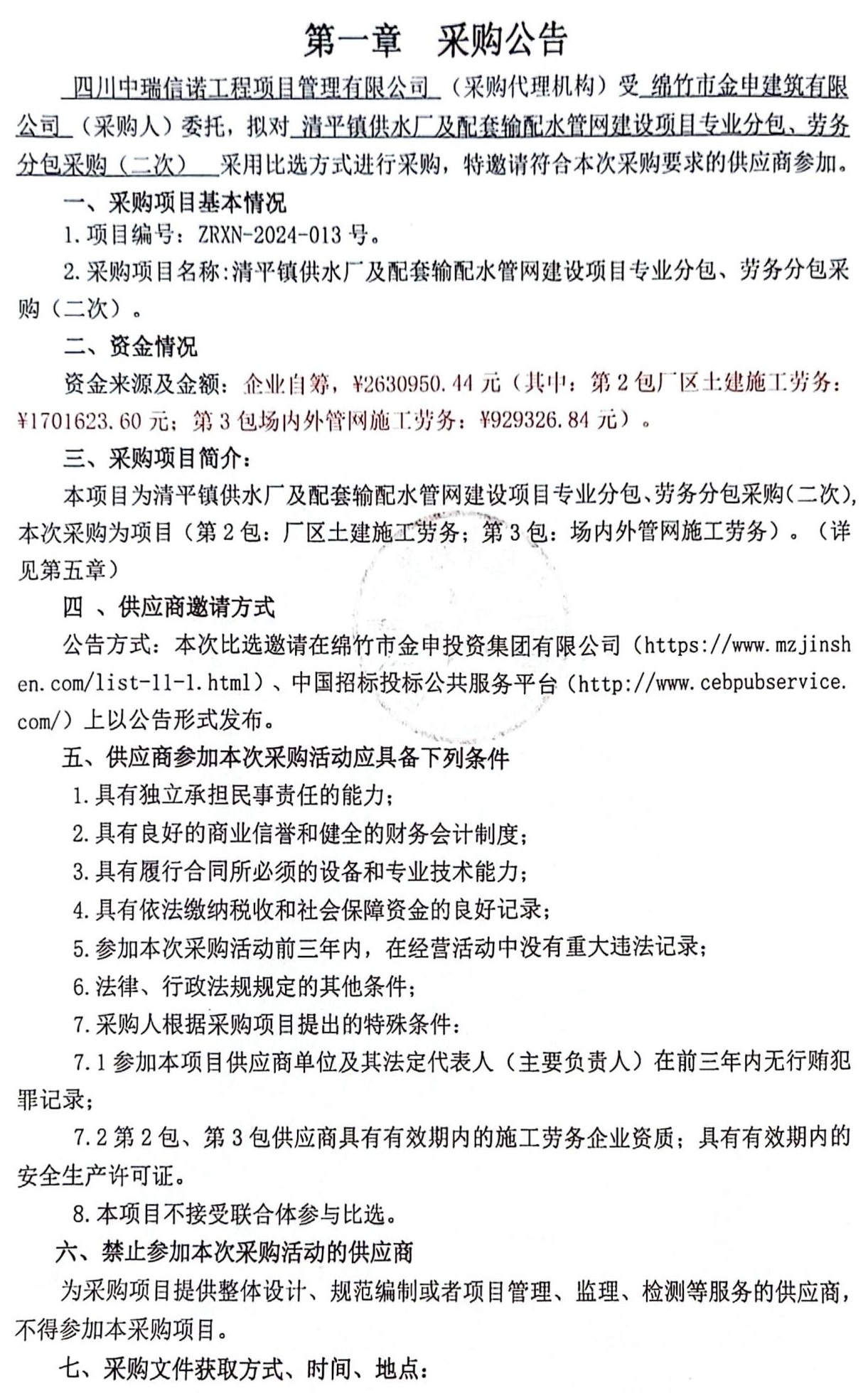 清平供水廠管網(wǎng)建設(shè)項目專業(yè)、勞務(wù)分包(二次)采購公告