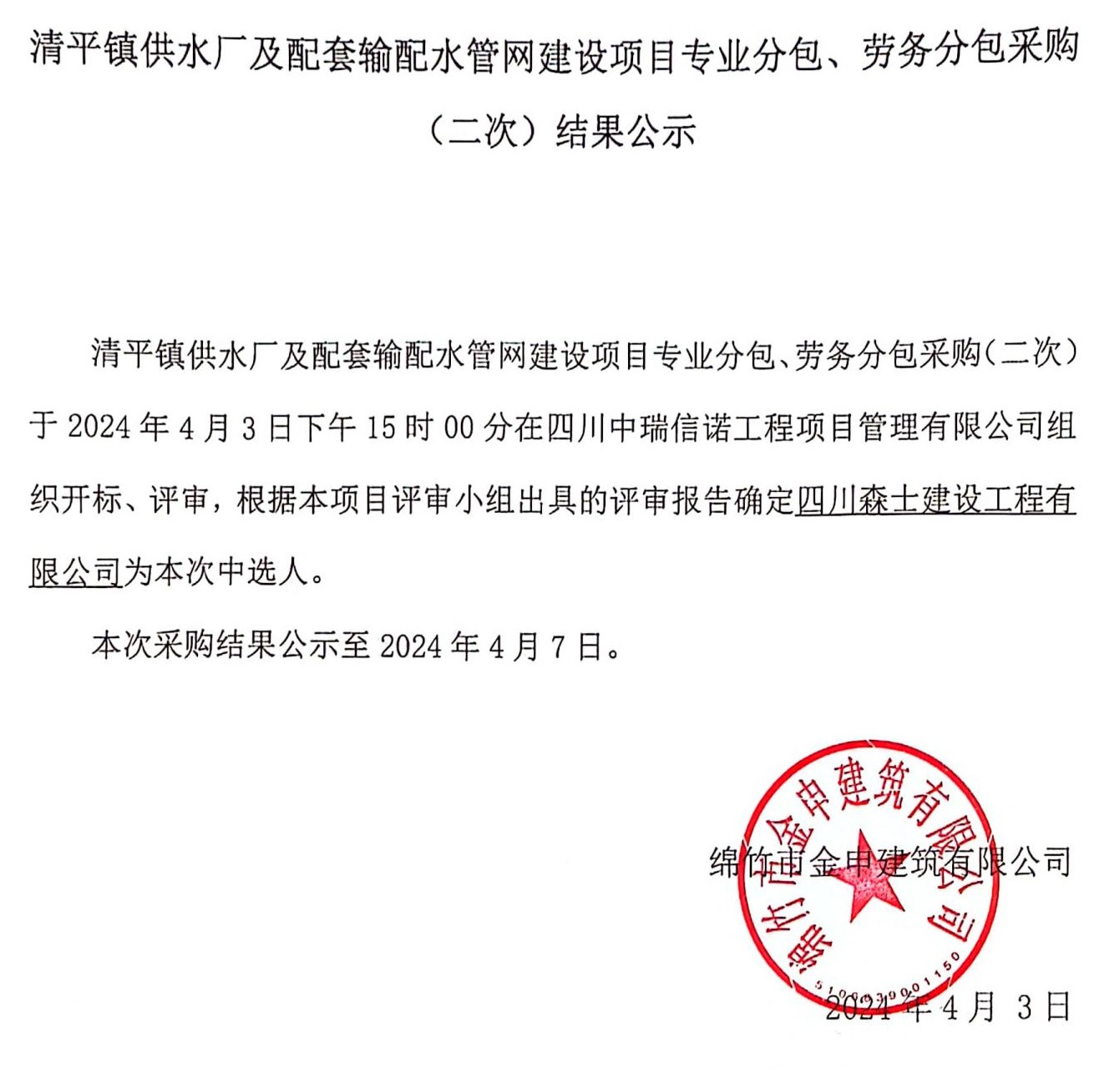 清平水廠配套管網(wǎng)項(xiàng)目分包、勞務(wù)分包(二次)結(jié)果公示