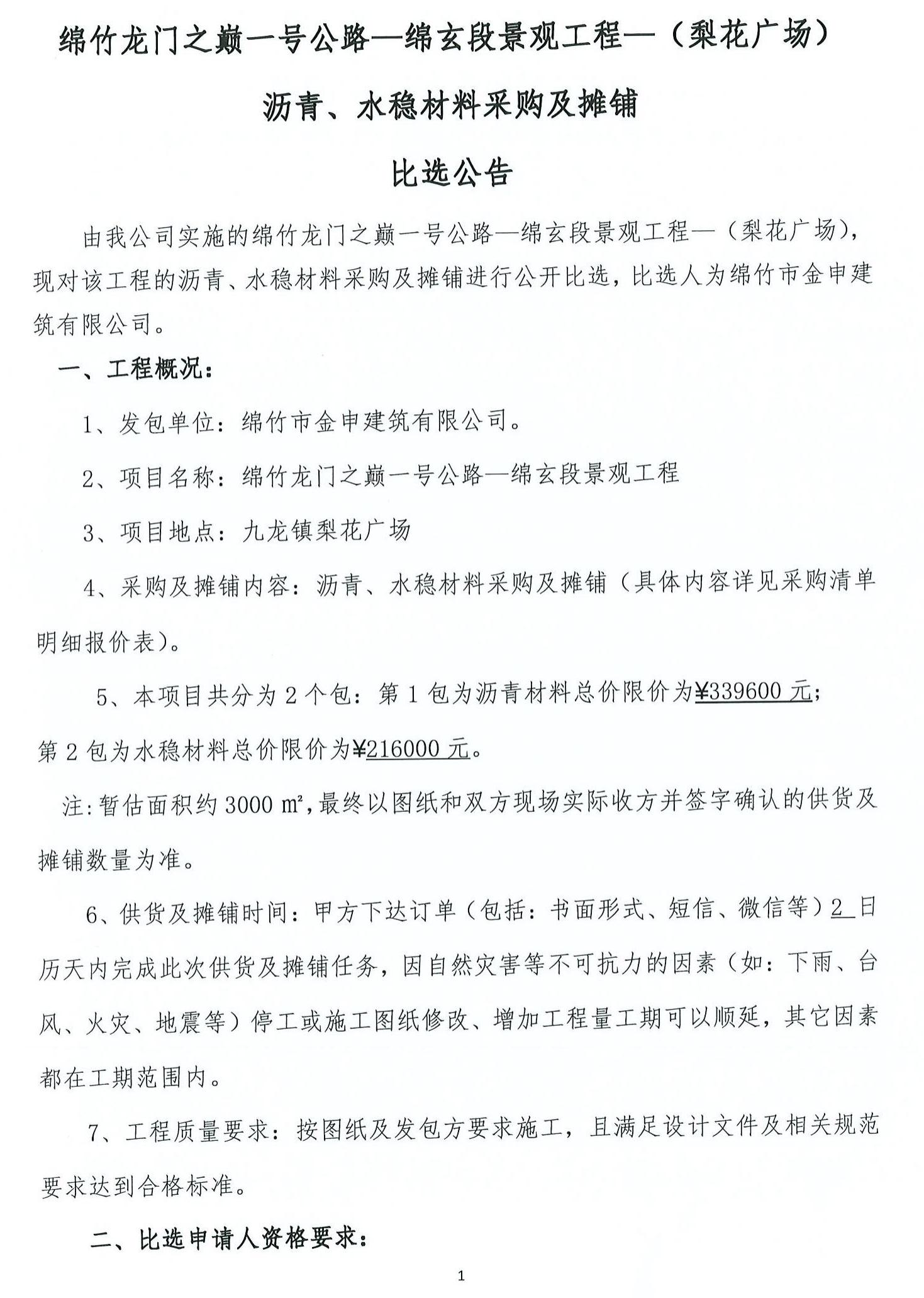龍門之巔一號公路綿玄段(梨花廣場)瀝青、水穩(wěn)比選公告