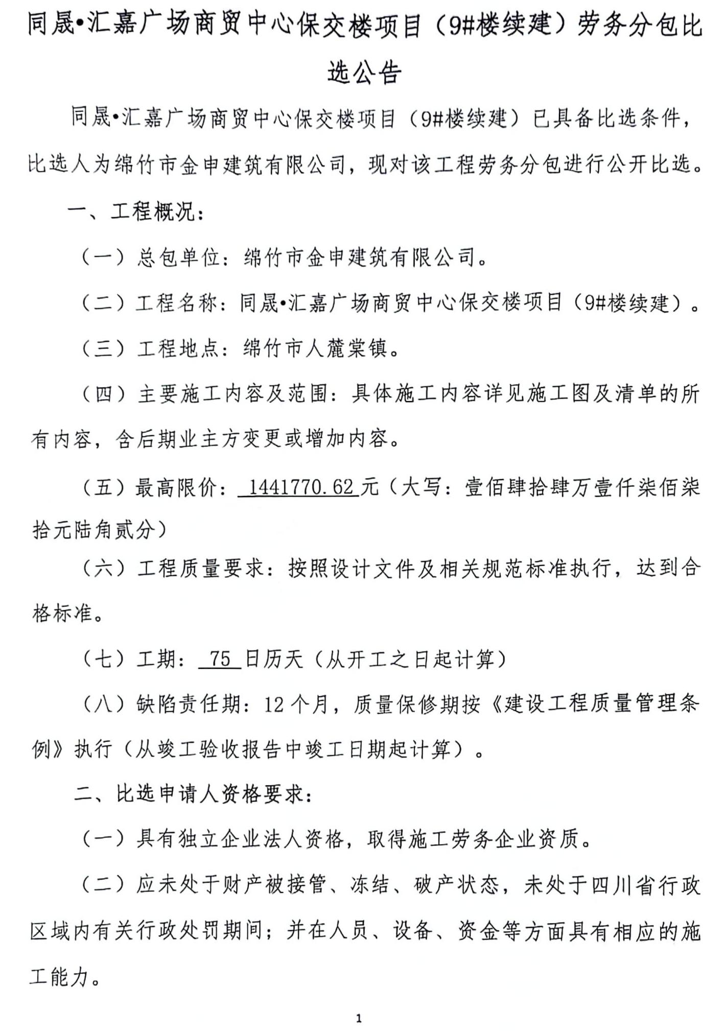 同晟·匯嘉廣場(chǎng)商貿(mào)中心保交樓(9#樓續(xù)建)勞務(wù)比選公告