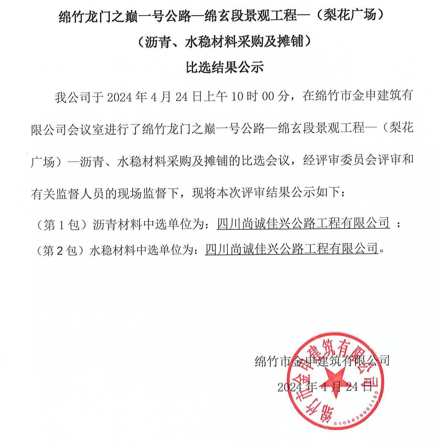 龍門之巔一號公路綿玄段(梨花廣場)瀝青、水穩(wěn)結(jié)果公示