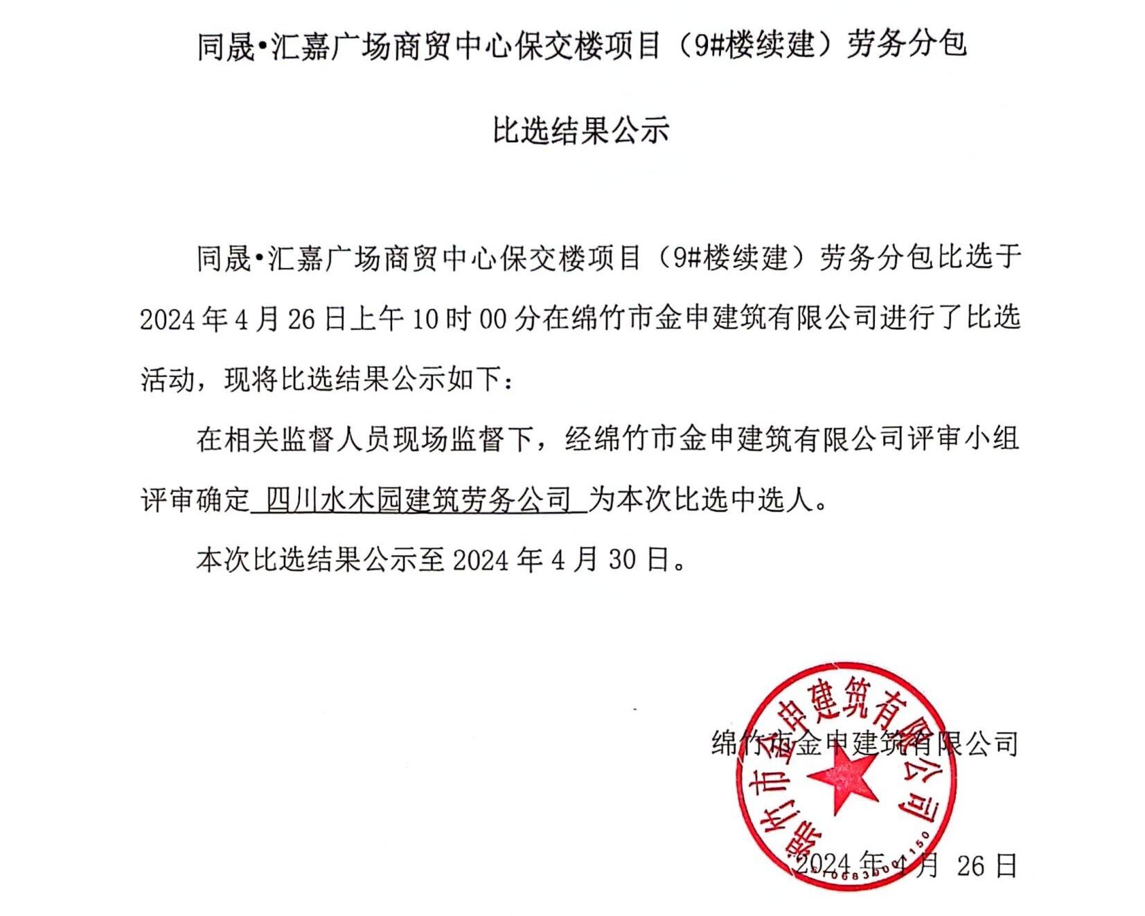 同晟·匯嘉廣場商貿(mào)中心保交樓(9#樓續(xù)建)比選結(jié)果公示