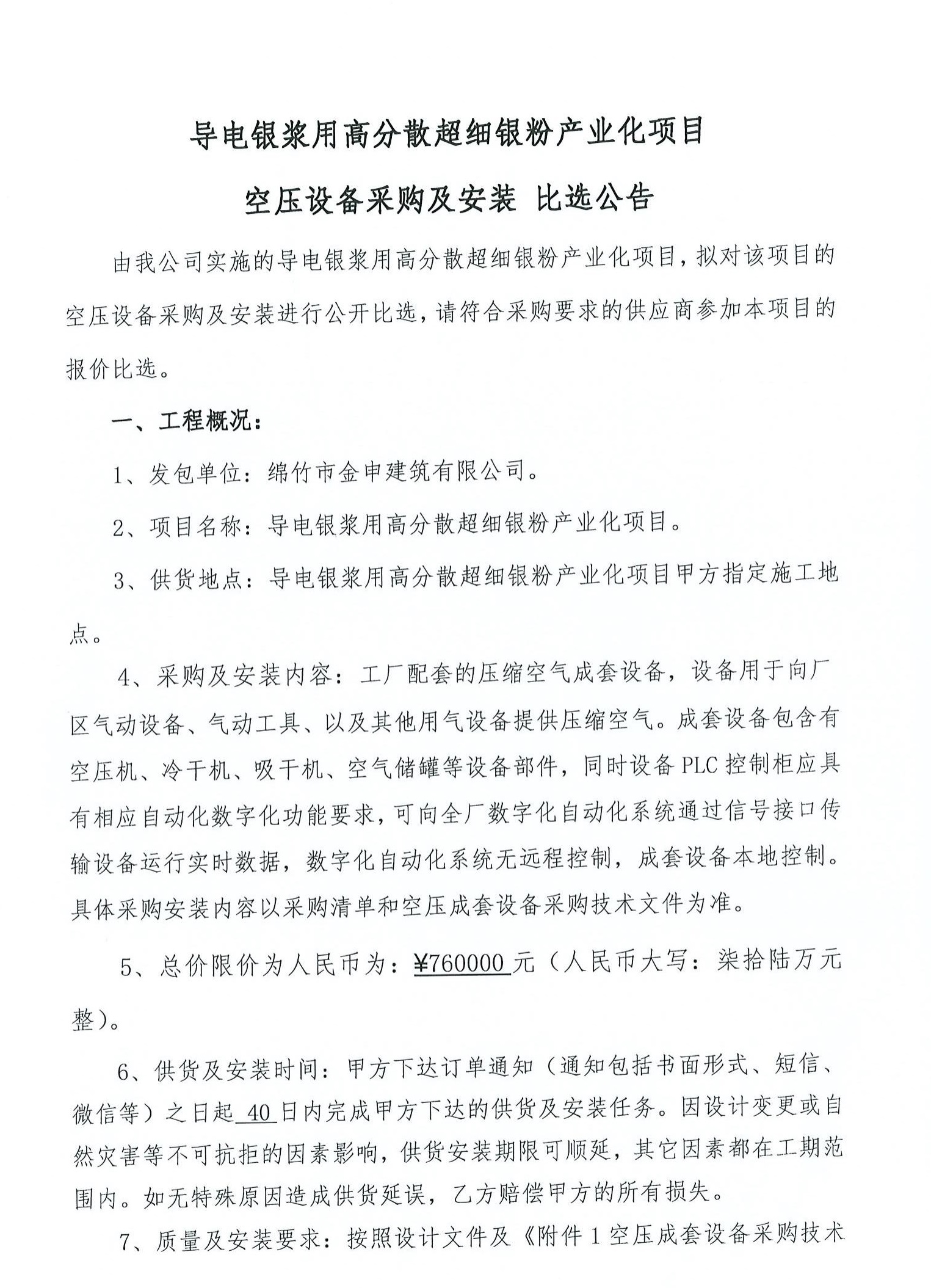 導(dǎo)電銀漿用高分散超細(xì)銀粉產(chǎn)業(yè)化項(xiàng)目 空壓設(shè)備 比選公告