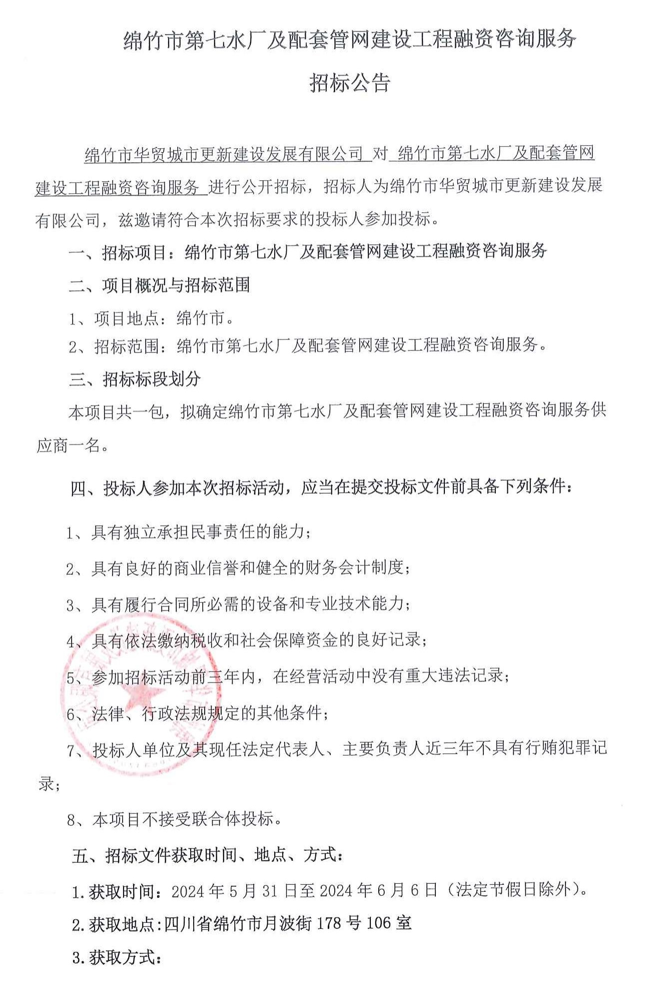 綿竹市第七水廠及配套管網(wǎng)建設(shè)工程融資咨詢服務(wù)招標(biāo)公告