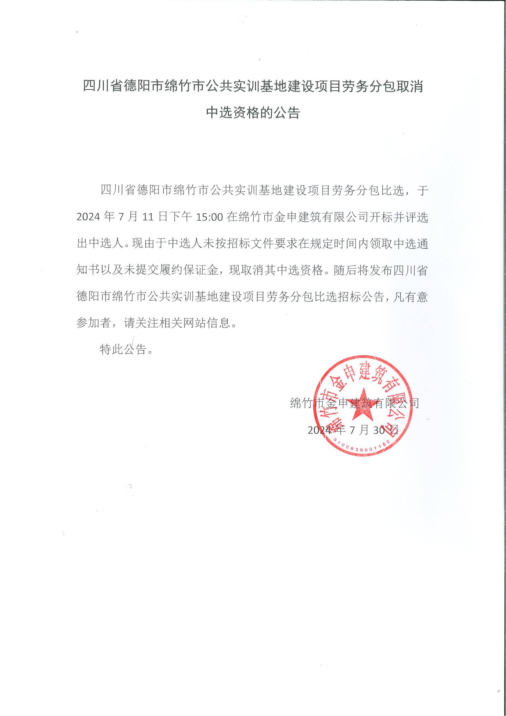 綿竹市公共實(shí)訓(xùn)基地建設(shè)項(xiàng)目勞務(wù)分包取消中選資格的公告
