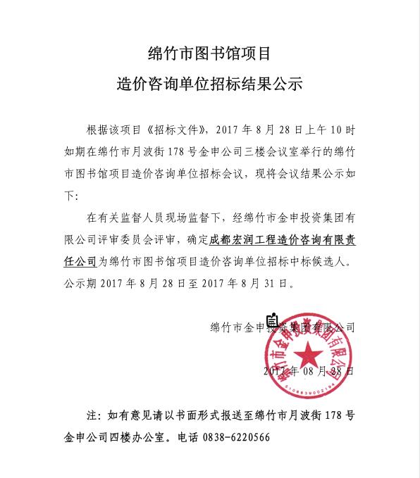 綿竹市圖書館項目造價咨詢單位招標(biāo)結(jié)果公示