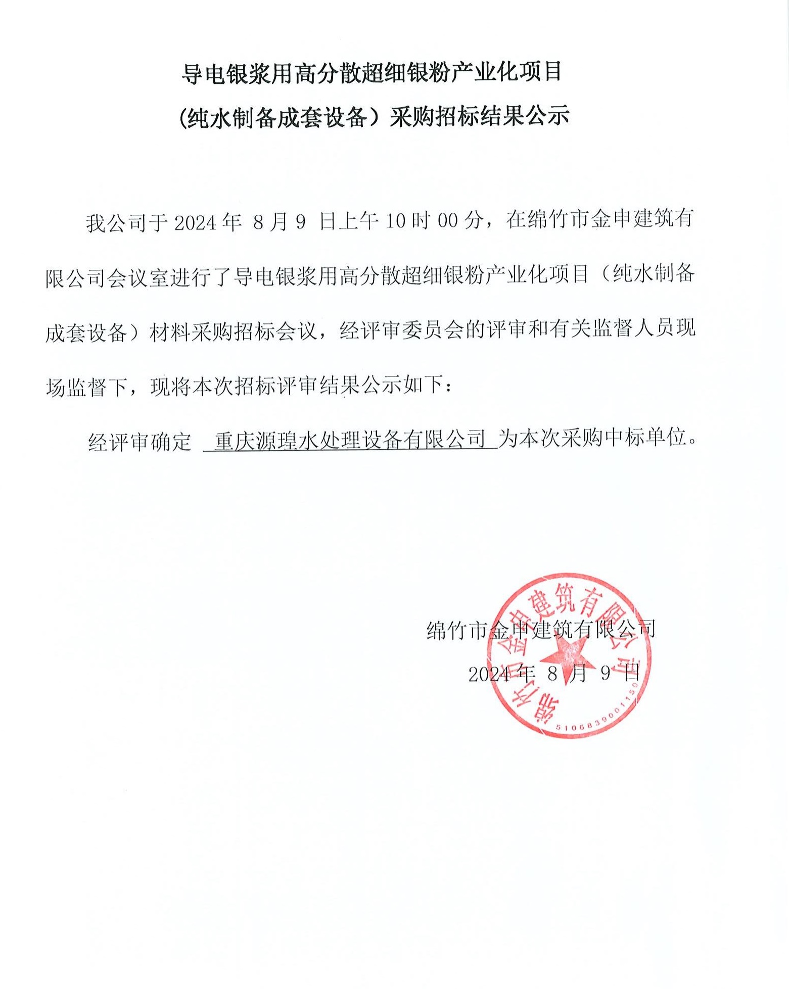 純水制備成套設(shè)備采購(gòu)招標(biāo)結(jié)果公示