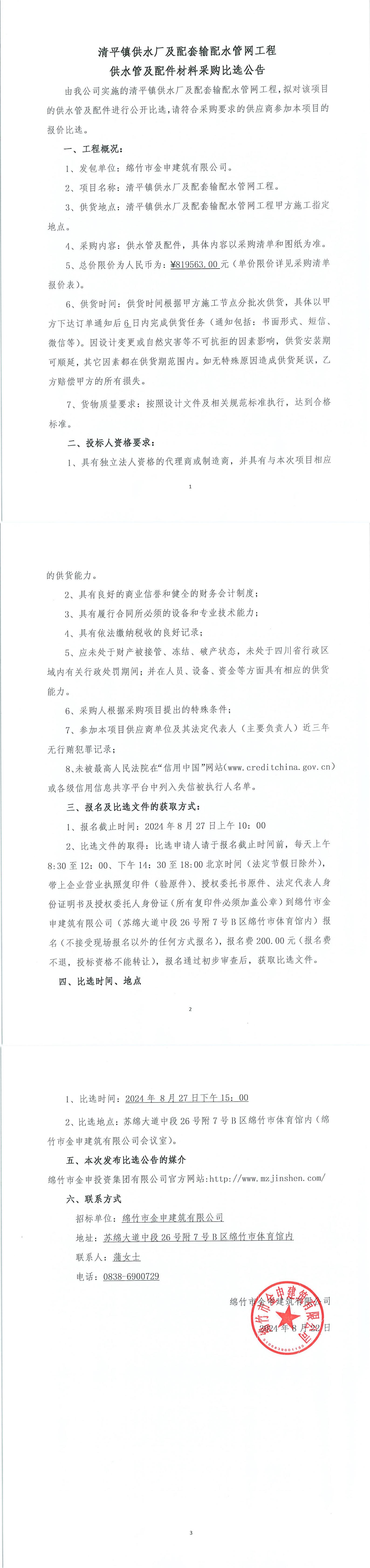 清平鎮(zhèn)供水廠及配套輸配水管網(wǎng)工程(管件)采購(gòu)比選公告
