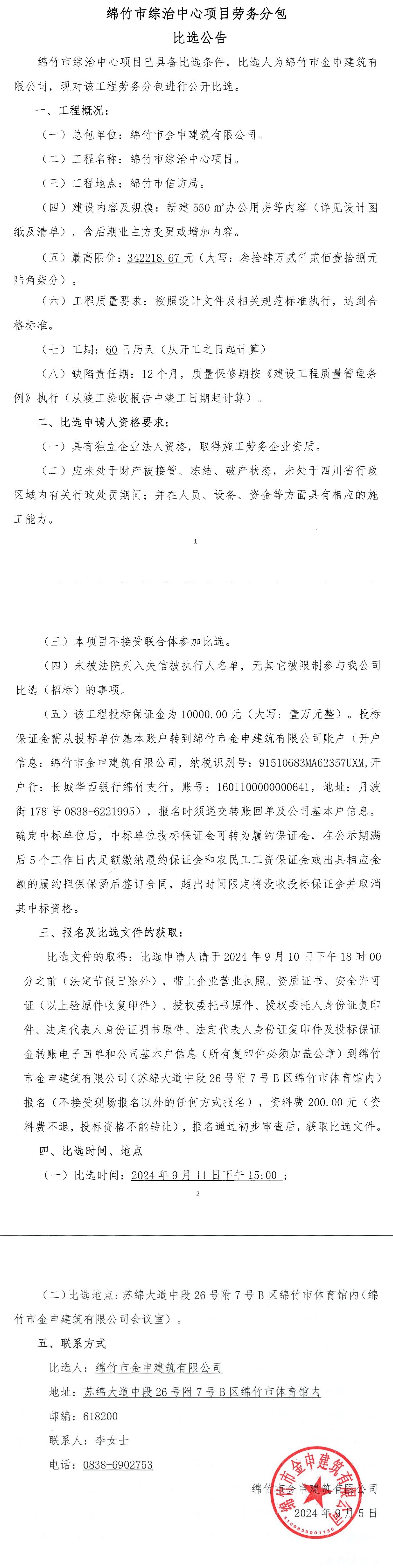 綿竹市綜治中心項(xiàng)目勞務(wù)分包比選公告