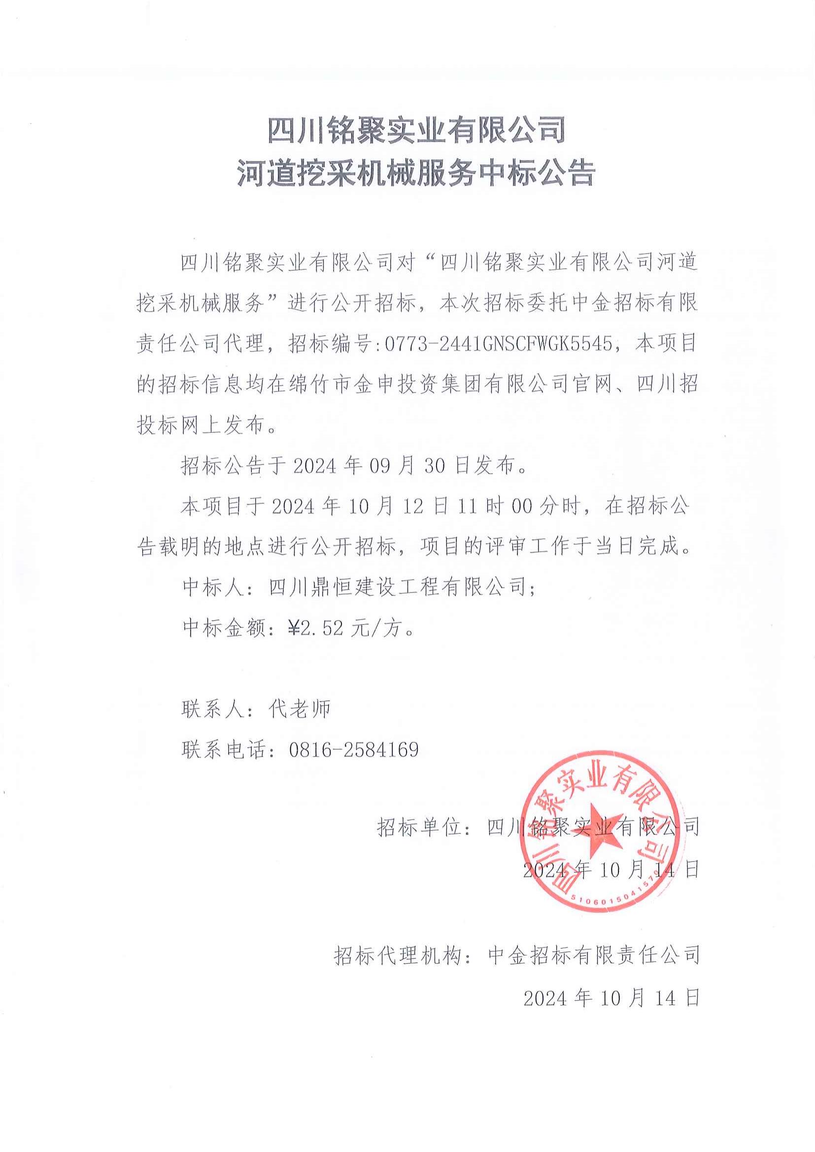四川銘聚實業(yè)有限公司河道挖采機械服務(wù)中標公告