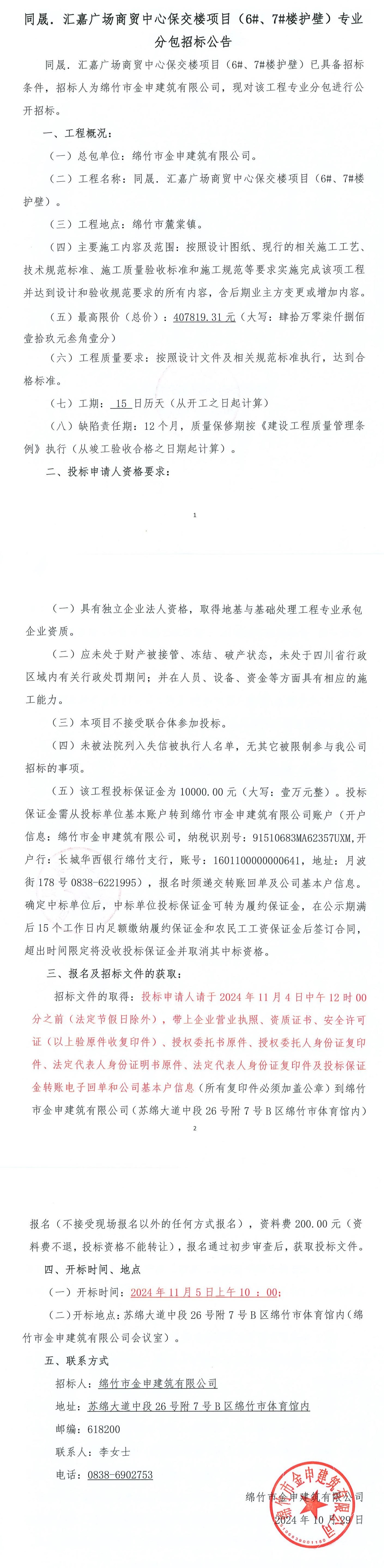 同晟.匯嘉廣場(chǎng)商貿(mào)中心保交樓項(xiàng)目專業(yè)分包招標(biāo)公告