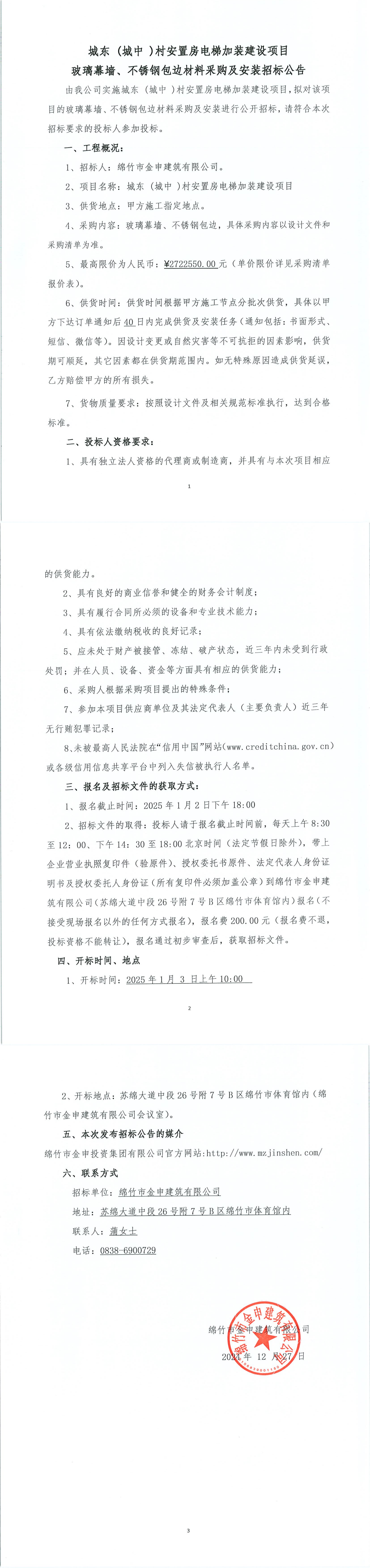 安置房電梯加裝項(xiàng)目玻璃幕墻、不銹鋼包邊招標(biāo)公告